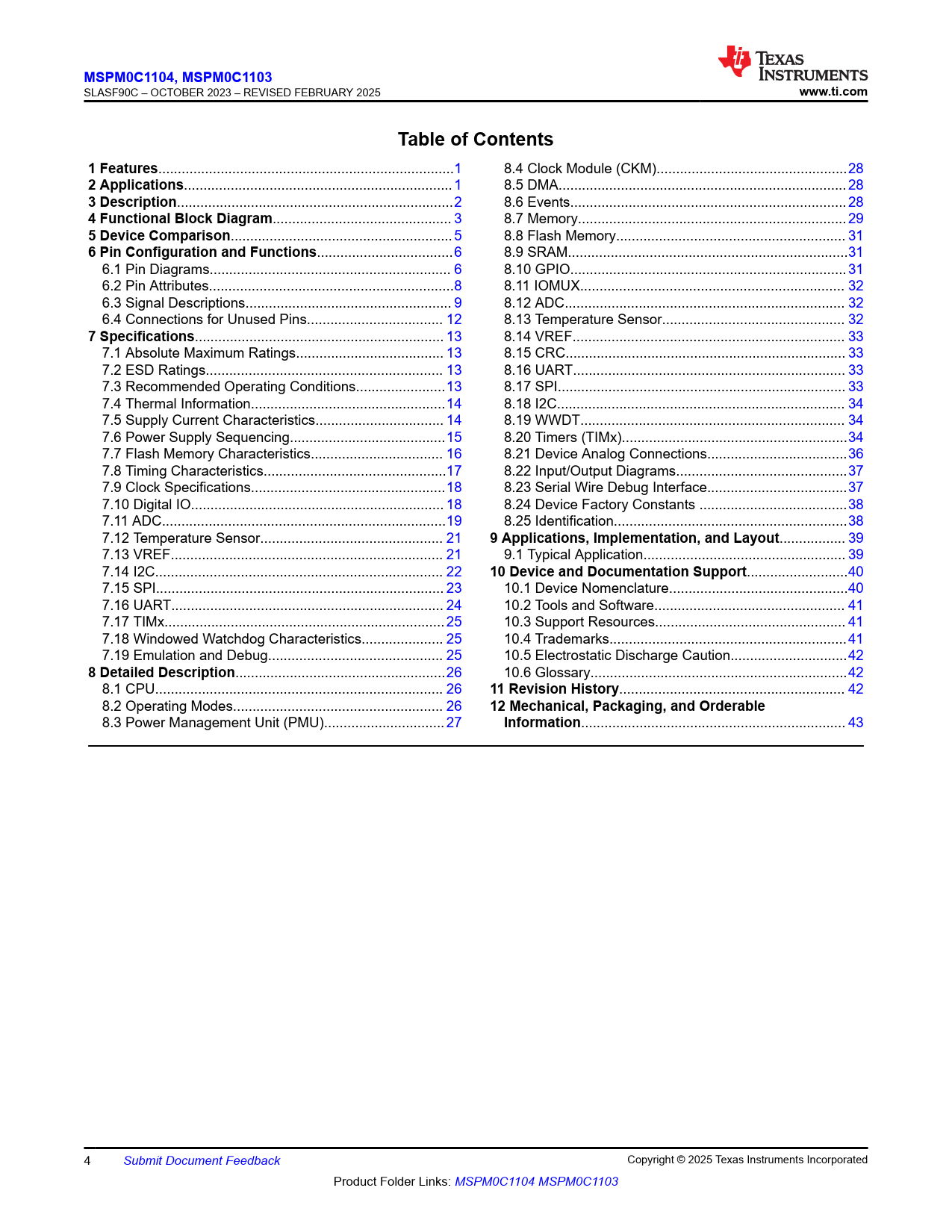 MSPM0C1104. , MSPM0C1103. www.ti.com. Table of Contents. 1 Features. 2 Applications. 3 Description. 4 Functional Block Diagram