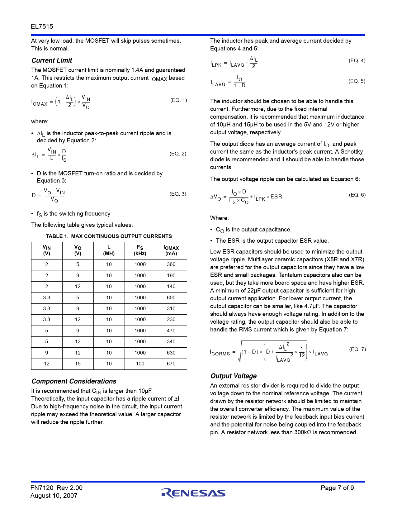 link to page 7 link to page 7 link to page 7 link to page 7 link to page 7 link to page 7 link to page 7 EL7515 At very low load, the MOSFET will skip pulses sometimes. The inductor has peak and average current decided by This is normal. Equations 4 and 5: I