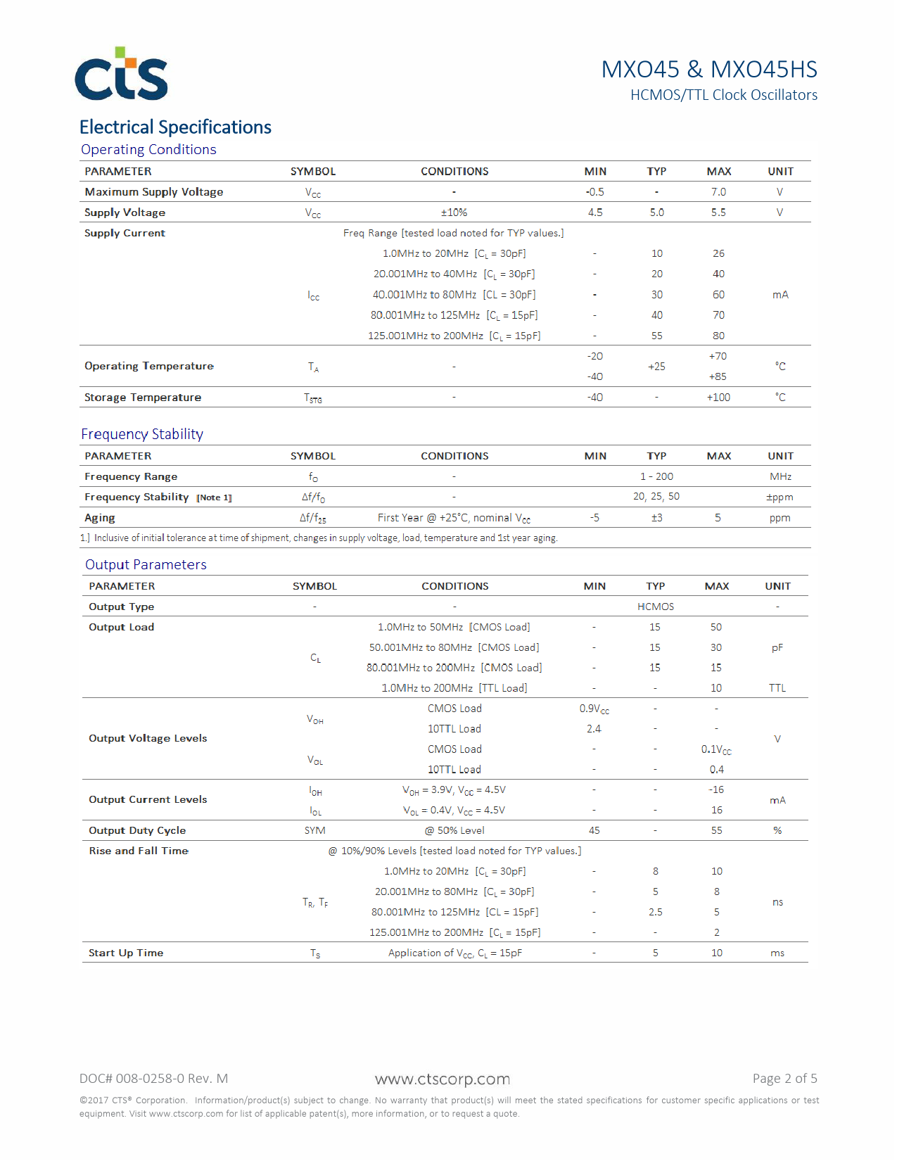 MXO45. &. MXO45HS. HCMOS/TTL. Clock. Oscillators. Electrical. Specifications. DOC#. 008-0258-0. Rev. M. Page. 2. of. 5. ©2017. CTS®. Corporation