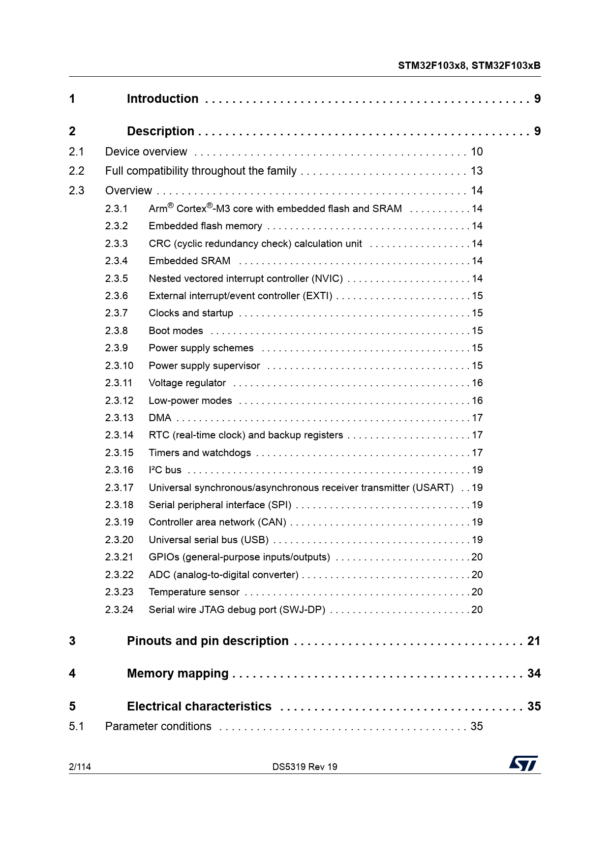 2.1 Device overview . 10 2.2 Full compatibility throughout the family . 13 2.3 Overview . 14 2.3.1 Arm® Cortex®-M3 core with embedded flash and SRAM . 14 2.3.2 Embedded flash memory . 14 2.3.3 CRC (cyclic redundancy check) calculation unit . 14 2.3.4 Embedded SRAM . 14 2.3.5 Nested vectored interrupt controller (NVIC) . 14 2.3.6 External interrupt/event controller (EXTI) . 15 2.3.7 Clocks and startup . 15 2.3.8 Boot modes . 15 2.3.9 Power supply schemes . 15 2.3.10 Power supply supervisor . 15 2.3.11 Voltage regulator . 16 2.3.12 Low-power modes . 16 2.3.13 DMA . 17 2.3.14 RTC (real-time clock) and backup registers . 17 2.3.15 Timers and watchdogs . 17 2.3.16 I²C bus . 19 2.3.17 Universal synchronous/asynchronous receiver transmitter (USART) . 19 2.3.18 Serial peripheral interface (SPI) . 19 2.3.19 Controller area network (CAN) . 19 2.3.20 Universal serial bus (USB) . 19 2.3.21 GPIOs (general-purpose inputs/outputs) . 20 2.3.22 ADC (analog-to-digital converter) . 20 2.3.23 Temperature sensor . 20 2.3.24 Serial wire JTAG debug port (SWJ-DP) . 20