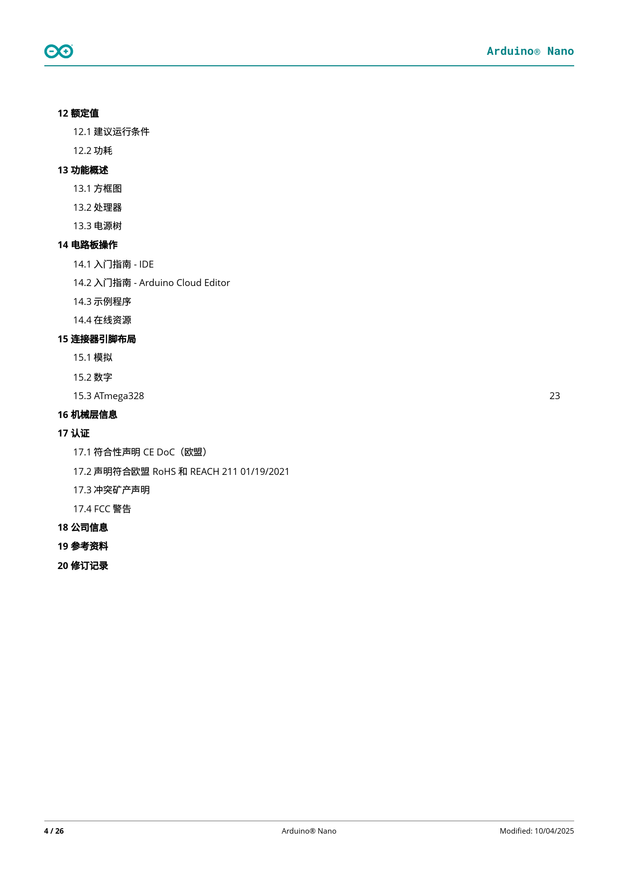 link to page 17 link to page 17 link to page 18 link to page 18 link to page 18 link to page 19 link to page 19 link to page 20 link to page 20 link to page 20 link to page 20 link to page 20 link to page 21 link to page 22 link to page 22 link to page 23 link to page 23 link to page 24 link to page 24 link to page 24 link to page 25 link to page 25 link to page 26 link to page 26 link to page 26 Arduino® Nano12 额定值 12.1 建议运⾏条件 12.2 功耗 13 功能概述 13.1 ⽅框图 13.2 处理器 13.3 电源树 14 电路板操作 14.1 ⼊⻔指南 - IDE 14.2 ⼊⻔指南 - Arduino Cloud Editor 14.3 ⽰例程序 14.4 在线资源 15 连接器引脚布局 15.1 模拟 15.2 数字 15.3 ATmega328 23 16 机械层信息 17 认证 17.1 符合性声明 CE DoC(欧盟) 17.2 声明符合欧盟 RoHS 和 REACH 211 01/19/2021 17.3 冲突矿产声明 17.4 FCC 警告 18 公司信息 19 参考资料 20 修订记录 4 / 26 Arduino® Nano Modified: 10/04/2025