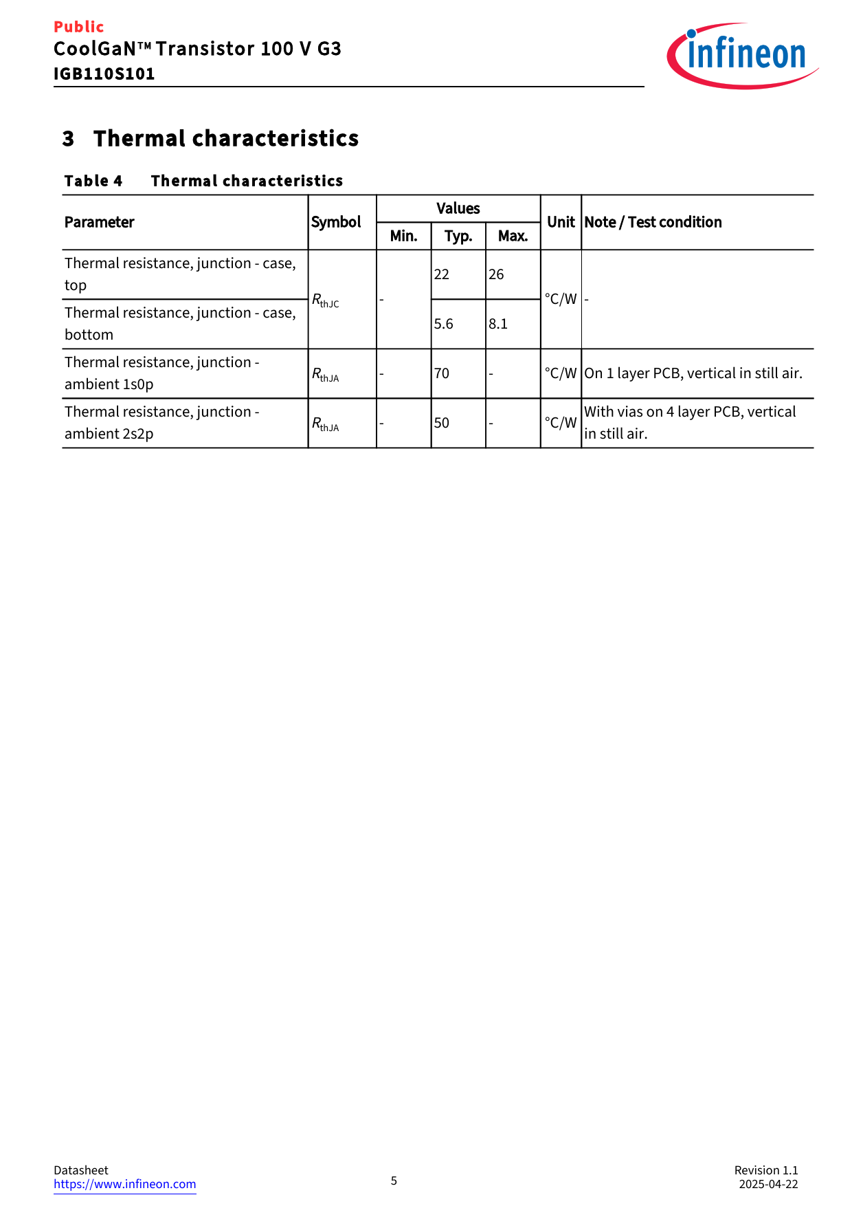 Public. IGB110S101. 3 Thermal characteristics. Table 4 Thermal characteristics