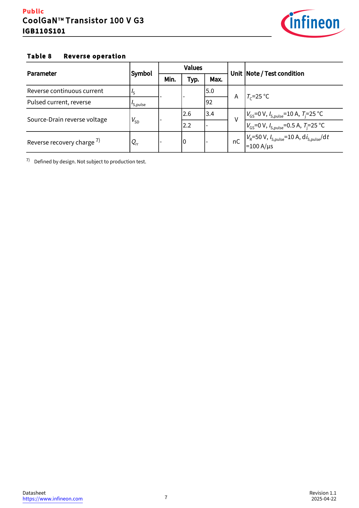 Values Parameter Symbol Unit Note / Test condition Min. Typ. Max. Reverse continuous current IS 5.0 ‑ ‑ A TC=25 °C Pulsed current, reverse IS,pulse 92 2.6 3.4 VGS=0 V, IS,pulse=10 A, Tj=25 °C Source‑Drain reverse voltage VSD ‑ V 2.2 ‑ VGS=0 V, IS,pulse=0.5 A, Tj=25 °C R IS,pulse iS,pulse t Reverse recovery charge 7) Qrr ‑ 0 ‑ nC V =50 V,  =10 A, d /d =100 A/μs 7)    Defined by design. Not subject to production test. Datasheet Revision 1.1 https://www.infineon.com 7 2025‑04‑22 Document Outline Description Maximum ratings Recommended operating conditions Thermal characteristics Electrical Characteristics Electrical characteristics diagrams Package outlines Appendix A Revision history Trademarks Disclaimer