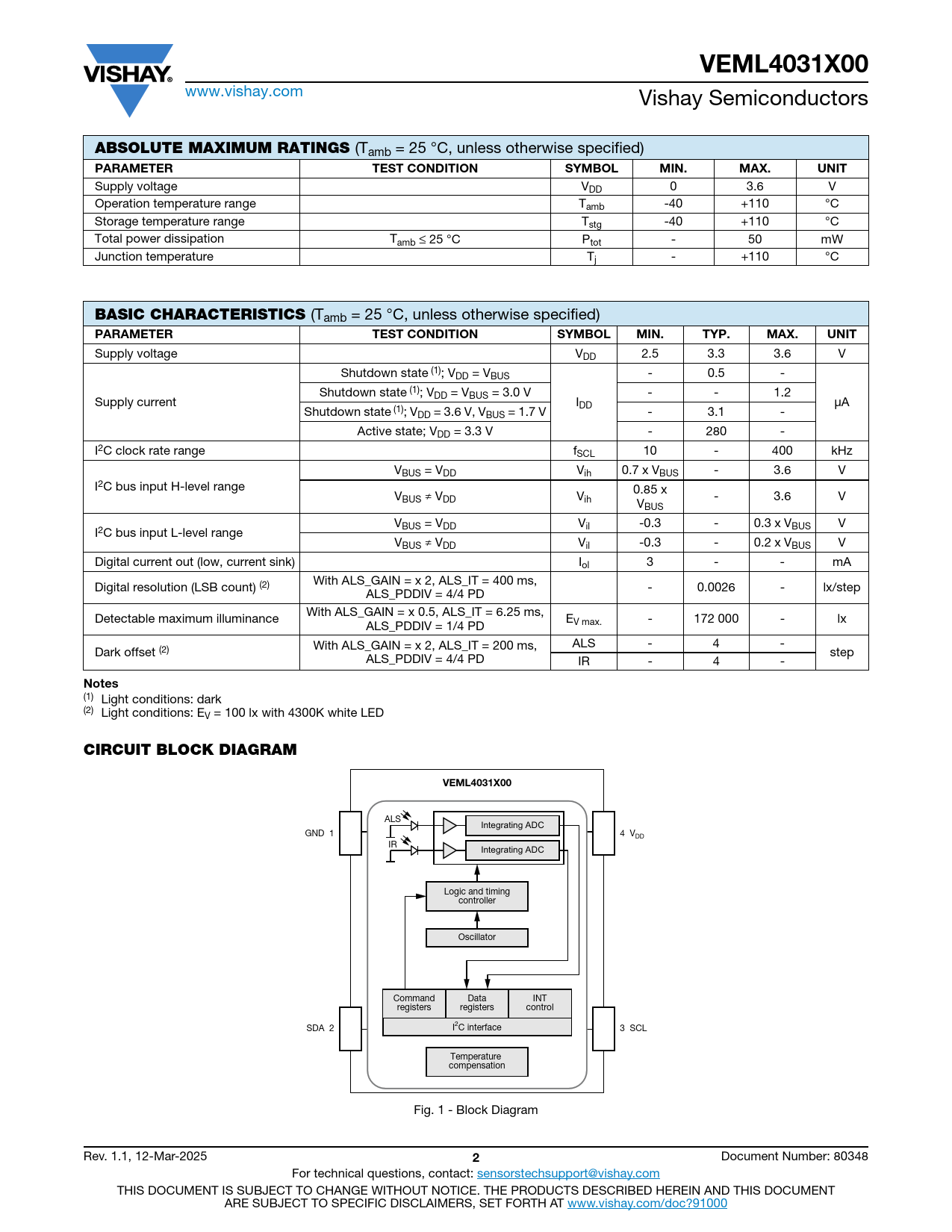 ALS Integrating ADC GND 1 4 VDD IR Integrating ADC Logic and timing controller Oscillator Command Data INT registers registers control SDA 2 I2C interface 3 SCL Temperature compensation Fig. 1 - Block Diagram Rev. 1.1, 12-Mar-2025