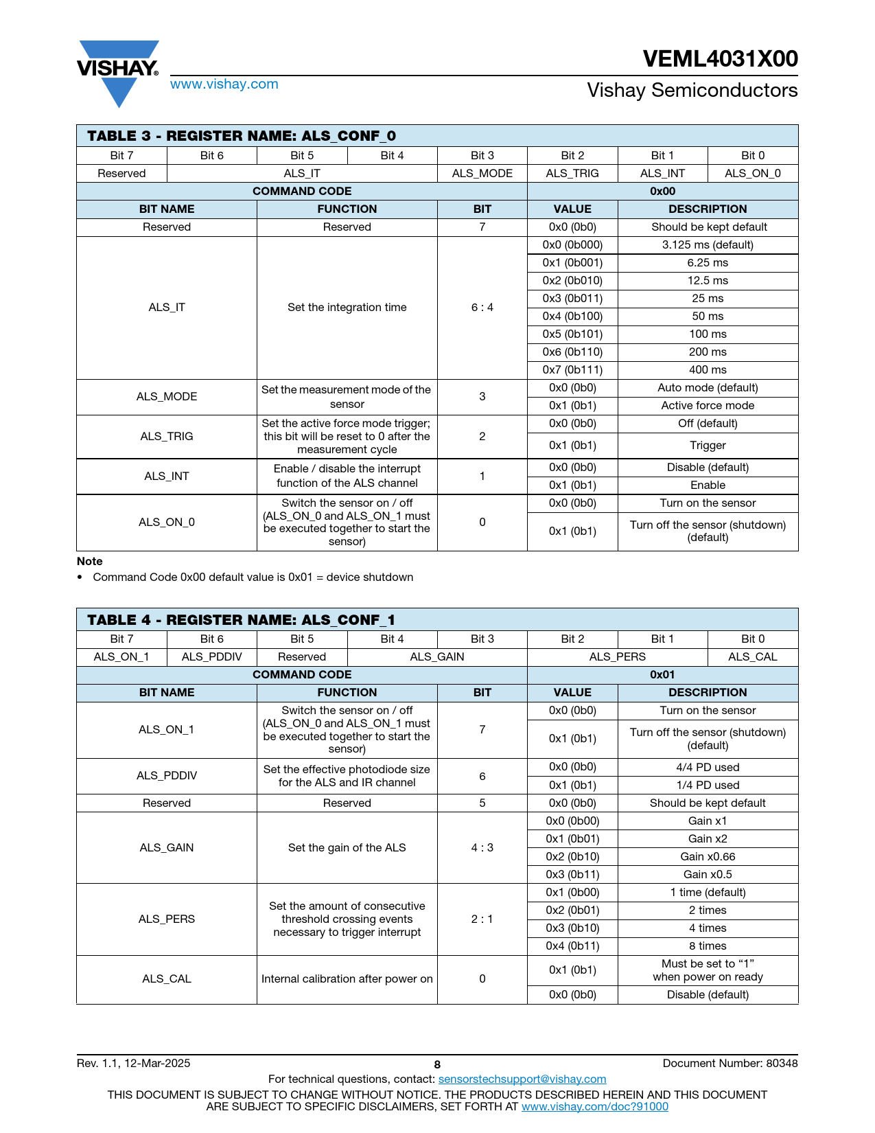 VEML4031X00 www.vishay.com Vishay Semiconductors TABLE 3 - REGISTER NAME: ALS_CONF_0 Bit 7 Bit 6 Bit 5 Bit 4 Bit 3 Bit 2 Bit 1 Bit 0 Reserved ALS_IT ALS_MODE ALS_TRIG ALS_INT ALS_ON_0 COMMAND CODE0x00BIT NAMEFUNCTIONBITVALUEDESCRIPTION Reserved Reserved 7 0x0 (0b0) Should be kept default 0x0 (0b000) 3.125 ms (default) 0x1 (0b001) 6.25 ms 0x2 (0b010) 12.5 ms 0x3 (0b011) 25 ms ALS_IT Set the integration time 6 : 4 0x4 (0b100) 50 ms 0x5 (0b101) 100 ms 0x6 (0b110) 200 ms 0x7 (0b111) 400 ms Set the measurement mode of the 0x0 (0b0) Auto mode (default) ALS_MODE 3 sensor 0x1 (0b1) Active force mode Set the active force mode trigger; 0x0 (0b0) Off (default) ALS_TRIG this bit will be reset to 0 after the 2 measurement cycle 0x1 (0b1) Trigger Enable / disable the interrupt 0x0 (0b0) Disable (default) ALS_INT 1 function of the ALS channel 0x1 (0b1) Enable Switch the sensor on / off 0x0 (0b0) Turn on the sensor (ALS_ON_0 and ALS_ON_1 must ALS_ON_0 0 be executed together to start the Turn off the sensor (shutdown) 0x1 (0b1) sensor) (default) Note • Command Code 0x00 default value is 0x01 = device shutdown TABLE 4 - REGISTER NAME: ALS_CONF_1 Bit 7 Bit 6 Bit 5 Bit 4 Bit 3 Bit 2 Bit 1 Bit 0 ALS_ON_1 ALS_PDDIV Reserved ALS_GAIN ALS_PERS ALS_CAL COMMAND CODE0x01BIT NAMEFUNCTIONBITVALUEDESCRIPTION Switch the sensor on / off 0x0 (0b0) Turn on the sensor (ALS_ON_0 and ALS_ON_1 must ALS_ON_1 7 be executed together to start the Turn off the sensor (shutdown) 0x1 (0b1) sensor) (default) Set the effective photodiode size 0x0 (0b0) 4/4 PD used ALS_PDDIV 6 for the ALS and IR channel 0x1 (0b1) 1/4 PD used Reserved Reserved 5 0x0 (0b0) Should be kept default 0x0 (0b00) Gain x1 0x1 (0b01) Gain x2 ALS_GAIN Set the gain of the ALS 4 : 3 0x2 (0b10) Gain x0.66 0x3 (0b11) Gain x0.5 0x1 (0b00) 1 time (default) Set the amount of consecutive 0x2 (0b01) 2 times ALS_PERS threshold crossing events 2 : 1 necessary to trigger interrupt 0x3 (0b10) 4 times 0x4 (0b11) 8 times Must be set to “1” 0x1 (0b1) ALS_CAL Internal calibration after power on 0 when power on ready 0x0 (0b0) Disable (default) Rev. 1.1, 12-Mar-2025 8 Document Number: 80348 For technical questions, contact: sensorstechsupport@vishay.com THIS DOCUMENT IS SUBJECT TO CHANGE WITHOUT NOTICE. THE PRODUCTS DESCRIBED HEREIN AND THIS DOCUMENT ARE SUBJECT TO SPECIFIC DISCLAIMERS, SET FORTH AT www.vishay.com/doc?91000
