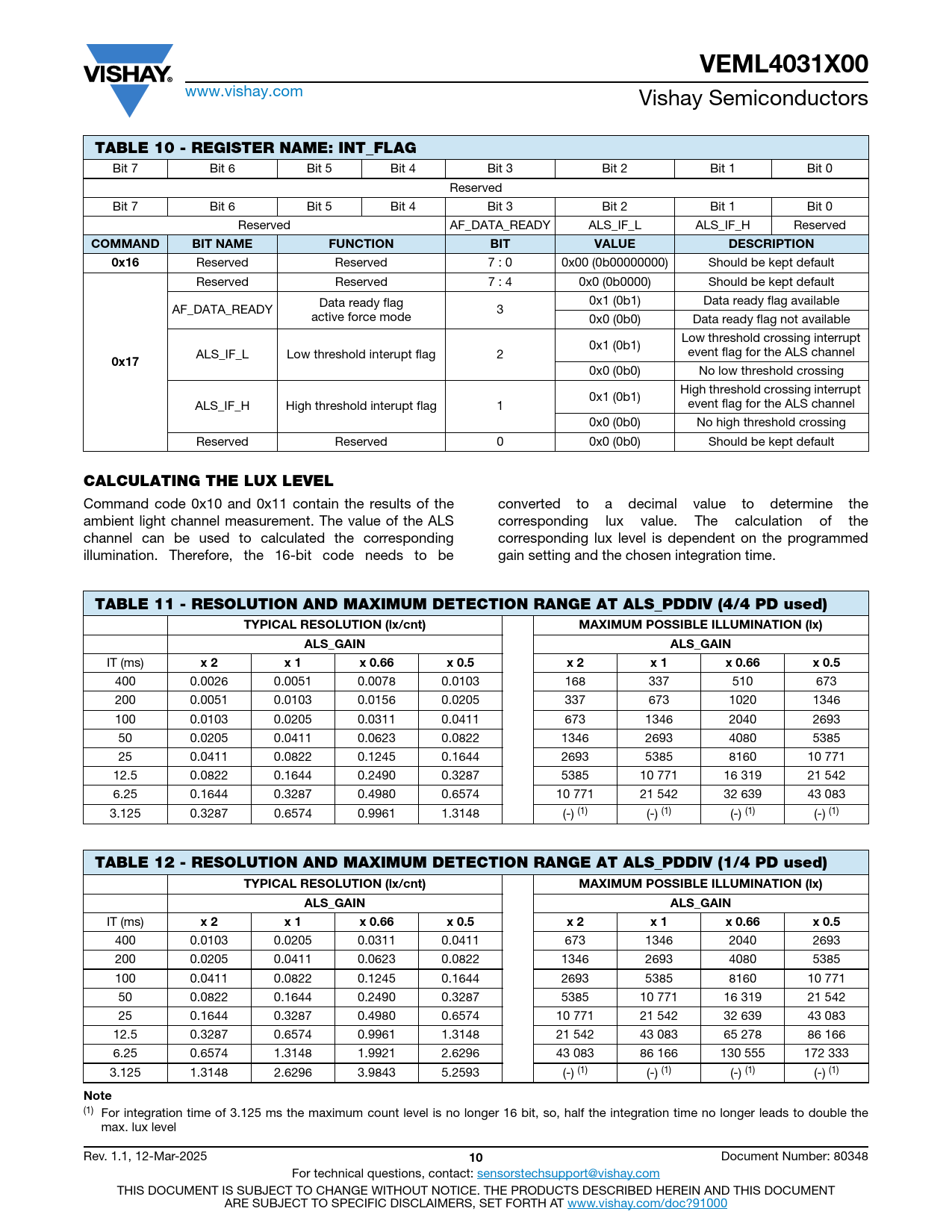 VEML4031X00. TABLE 10 - REGISTER NAME: INT_FLAG. COMMAND. BIT NAME. FUNCTION. BIT. VALUE. DESCRIPTION. 0x16. 0x17