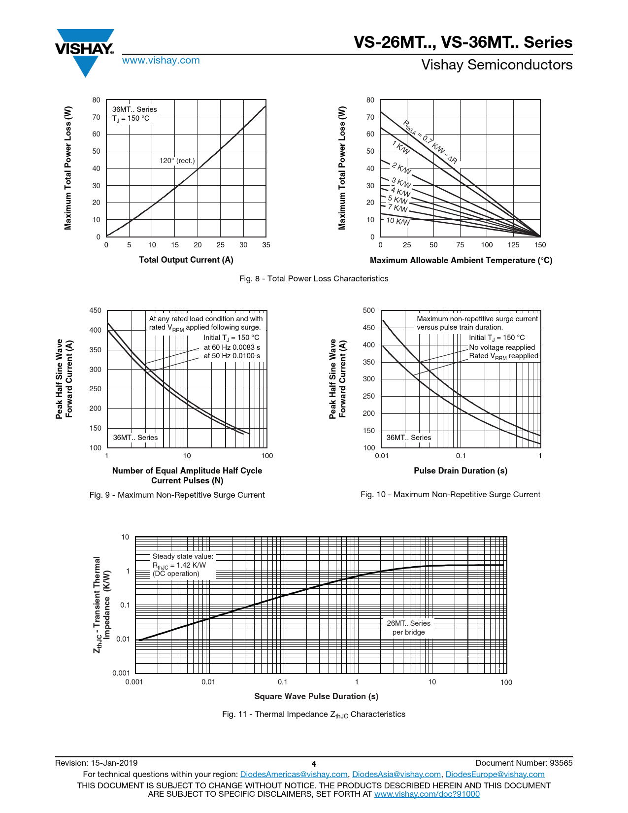 VS-26MT.., VS-36MT.. Series www.vishay.com Vishay Semiconductors 80 80 36MT.. Series 70 T = 150 °C 70 J RthSA 60 60 = 0.7 K/ 1 K/ W 50 50 W - Δ 120° (rect.) R 2 K/ 40 40 W 3 K/ 30 30 W 4 K/W 5 K/ 20 20 W 7 K/W 10 10 10 K/W Maximum Total Power Loss (W)Maximum Total Power Loss (W) 0 0 0 5 10 15 20 25 30 35 0 25 50 75 100 125 150 Total Output Current (A)Maximum Allowable Ambient Temperature (°C) Fig. 8 - Total Power Loss Characteristics 450 500 At any rated load condition and with Maximum non-repetitive surge current 400 rated V applied following surge. versus pulse train duration. RRM 450 Initial T = 150 °C Initial T = 150 °C J J at 60 Hz 0.0083 s 400 350 No voltage reapplied at 50 Hz 0.0100 s Rated V reapplied RRM 350 300 300 250 250 200 Peak Half Sine WaveForward Current (A)Peak Half Sine WaveForward Current (A) 200 150 150 36MT.. Series 36MT.. Series 100 100 1 10 100 0.01 0.1 1 Number of Equal Amplitude Half CyclePulse Drain Duration (s)Current Pulses (N) Fig. 9 - Maximum Non-Repetitive Surge Current Fig. 10 - Maximum Non-Repetitive Surge Current 10 Steady state value: R = 1.42 K/W thJC 1 (DC operation) 0.1 26MT.. Series - Transient Thermal per bridge Impedance (K/W) 0.01 thJCZ . 0.001 0.001 0.01 0.1 1 10 100 Square Wave Pulse Duration (s) Fig. 11 - Thermal Impedance ZthJC Characteristics Revision: 15-Jan-2019 4 Document Number: 93565 For technical questions within your region: DiodesAmericas@vishay.com, DiodesAsia@vishay.com, DiodesEurope@vishay.com THIS DOCUMENT IS SUBJECT TO CHANGE WITHOUT NOTICE. THE PRODUCTS DESCRIBED HEREIN AND THIS DOCUMENT ARE SUBJECT TO SPECIFIC DISCLAIMERS, SET FORTH AT www.vishay.com/doc?91000