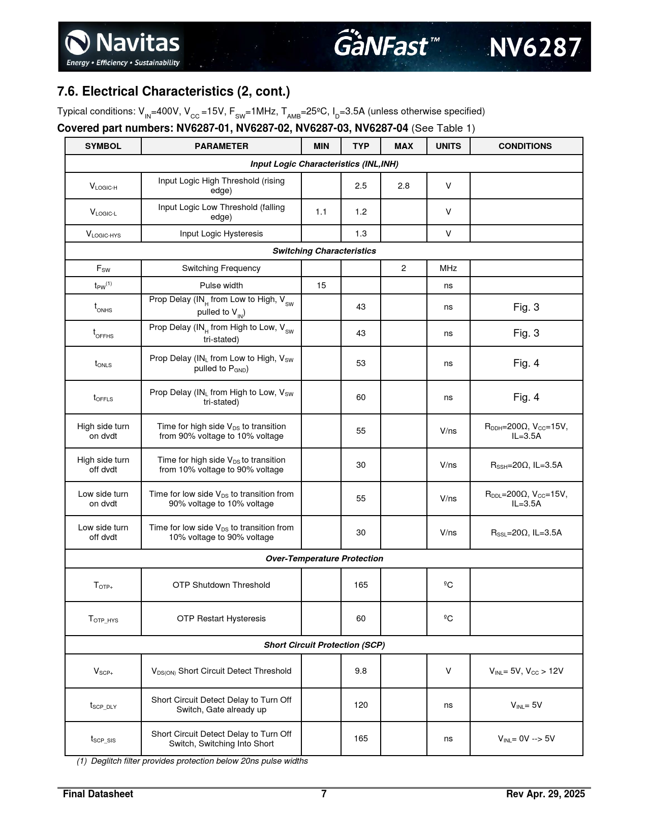 link to page 2 link to page 11 link to page 11 link to page 11 link to page 11 NV62877.6. Electrical Characteristics (2, cont.) Typical conditions: V =400V, V =15V, F =1MHz, T =25ºC, I =3.5A (unless otherwise specified) IN CC SW AMB D Covered part numbers: NV6287-01, NV6287-02, NV6287-03, NV6287-04 (See Table 1) SYMBOLPARAMETERMINTYPMAXUNITSCONDITIONSInput Logic Characteristics (INL,INH) Input Logic High Threshold (rising VLOGIC-H 2.5 2.8 V edge) Input Logic Low Threshold (falling VLOGIC-L 1.1 1.2 V edge) VLOGIC-HYS Input Logic Hysteresis 1.3 V Switching Characteristics FSW Switching Frequency 2 MHz t (1) PW Pulse width 15 ns Prop Delay (IN from Low to High, V t H SW 43 ns Fig. 3 ONHS pulled to V ) IN Prop Delay (IN from High to Low, V t H SW 43 ns Fig. 3 OFFHS tri-stated) Prop Delay (IN t L from Low to High, VSW ONLS 53 ns Fig. 4 pulled to PGND) Prop Delay (IN t L from High to Low, VSW OFFLS 60 ns Fig. 4 tri-stated) High side turn Time for high side VDS to transition R 55 V/ns DDH=200Ω, VCC=15V, on dvdt from 90% voltage to 10% voltage IL=3.5A High side turn Time for high side VDS to transition 30 V/ns R off dvdt from 10% voltage to 90% voltage SSH=20Ω, IL=3.5A Low side turn Time for low side VDS to transition from R 55 V/ns DDL=200Ω, VCC=15V, on dvdt 90% voltage to 10% voltage IL=3.5A Low side turn Time for low side VDS to transition from 30 V/ns R off dvdt 10% voltage to 90% voltage SSL=20Ω, IL=3.5A Over-Temperature Protection TOTP+ OTP Shutdown Threshold 165 ºC TOTP_HYS OTP Restart Hysteresis 60 ºC Short Circuit Protection (SCP) VSCP+ VDS(ON) Short Circuit Detect Threshold 9.8 V VINL= 5V, VCC > 12V Short Circuit Detect Delay to Turn Off tSCP_DLY 120 ns V Switch, Gate already up INL= 5V Short Circuit Detect Delay to Turn Off tSCP_SIS 165 ns V Switch, Switching Into Short INL= 0V --> 5V (1) Deglitch filter provides protection below 20ns pulse widths Final Datasheet7Rev Apr. 29, 2025