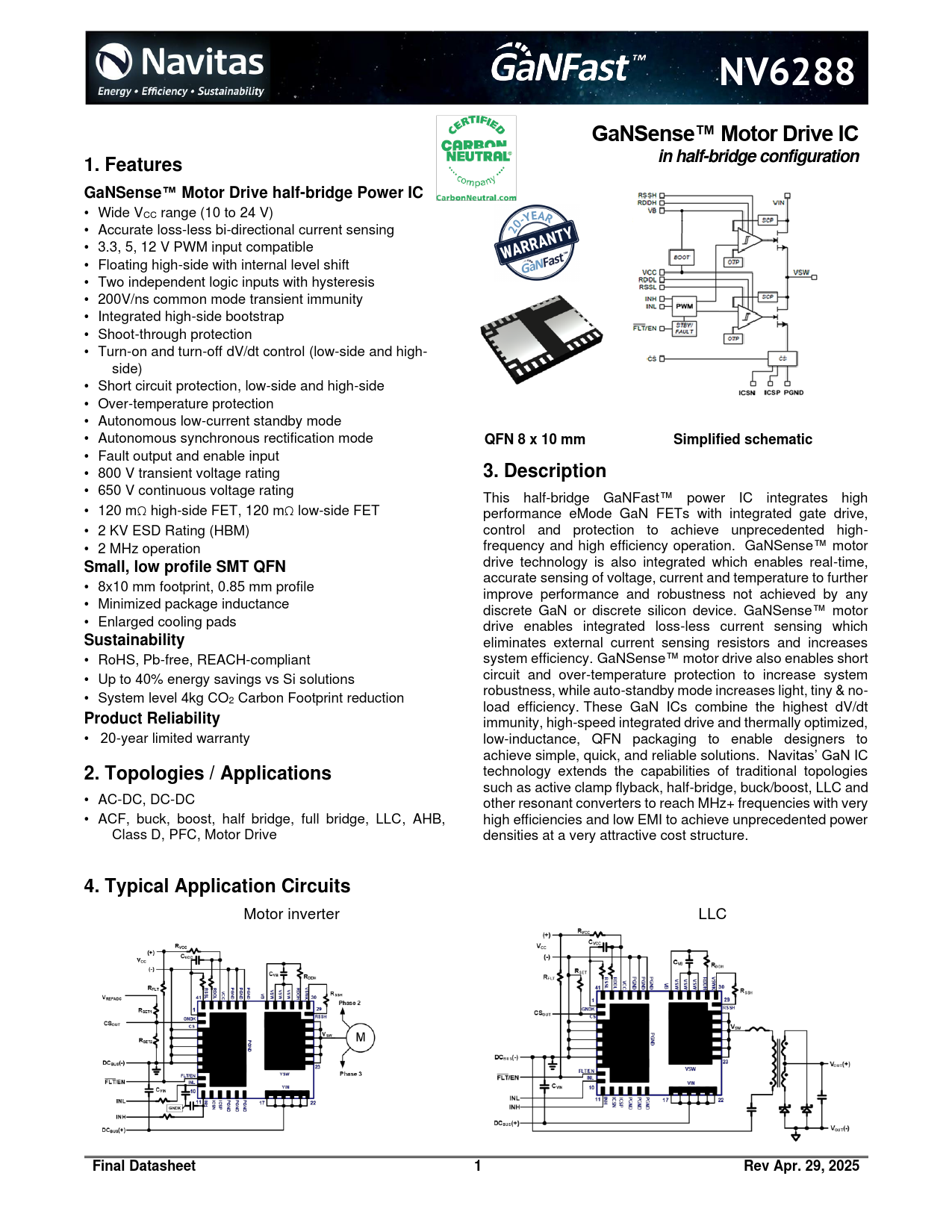 NV6288GaNSense™ Motor DriveICin half-bridge configuration1. FeaturesGaNSense™ Motor Drive half-bridge Power IC • Wide V CC range (10 to 24 V) • Accurate loss-less bi-directional current sensing • 3.3, 5, 12 V PWM input compatible • Floating high-side with internal level shift • Two independent logic inputs with hysteresis • 200V/ns common mode transient immunity • Integrated high-side bootstrap • Shoot-through protection • Turn-on and turn-off dV/dt control (low-side and high- side) • Short circuit protection, low-side and high-side • Over-temperature protection • Autonomous low-current standby mode • Autonomous synchronous rectification mode QFN 8 x 10 mmSimplified schematic • Fault output and enable input • 800 V transient voltage rating 3. Description • 650 V continuous voltage rating This half-bridge GaNFast™ power IC integrates high • 120 mΩ high-side FET, 120 mΩ low-side FET performance eMode GaN FETs with integrated gate drive, • 2 KV ESD Rating (HBM) control and protection to achieve unprecedented high- • 2 MHz operation frequency and high efficiency operation. GaNSense™ motor Small, low profile SMT QFN drive technology is also integrated which enables real-time, • accurate sensing of voltage, current and temperature to further 8x10 mm footprint, 0.85 mm profile improve performance and robustness not achieved by any • Minimized package inductance discrete GaN or discrete silicon device. GaNSense™ motor • Enlarged cooling pads drive enables integrated loss-less current sensing which Sustainability eliminates external current sensing resistors and increases • RoHS, Pb-free, REACH-compliant system efficiency. GaNSense™ motor drive also enables short • Up to 40% energy savings vs Si solutions circuit and over-temperature protection to increase system • robustness, while auto-standby mode increases light, tiny & no- System level 4kg CO2 Carbon Footprint reduction load efficiency. These GaN ICs combine the highest dV/dt Product Reliability immunity, high-speed integrated drive and thermally optimized, • 20-year limited warranty low-inductance, QFN packaging to enable designers to achieve simple, quick, and reliable solutions. Navitas’ GaN IC 2. Topologies / Applications technology extends the capabilities of traditional topologies such as active clamp flyback, half-bridge, buck/boost, LLC and • AC-DC, DC-DC other resonant converters to reach MHz+ frequencies with very • ACF, buck, boost, half bridge, full bridge, LLC, AHB, high efficiencies and low EMI to achieve unprecedented power Class D, PFC, Motor Drive densities at a very attractive cost structure. 4. Typical Application Circuits Motor inverter LLC Final Datasheet1Rev Apr. 29, 2025