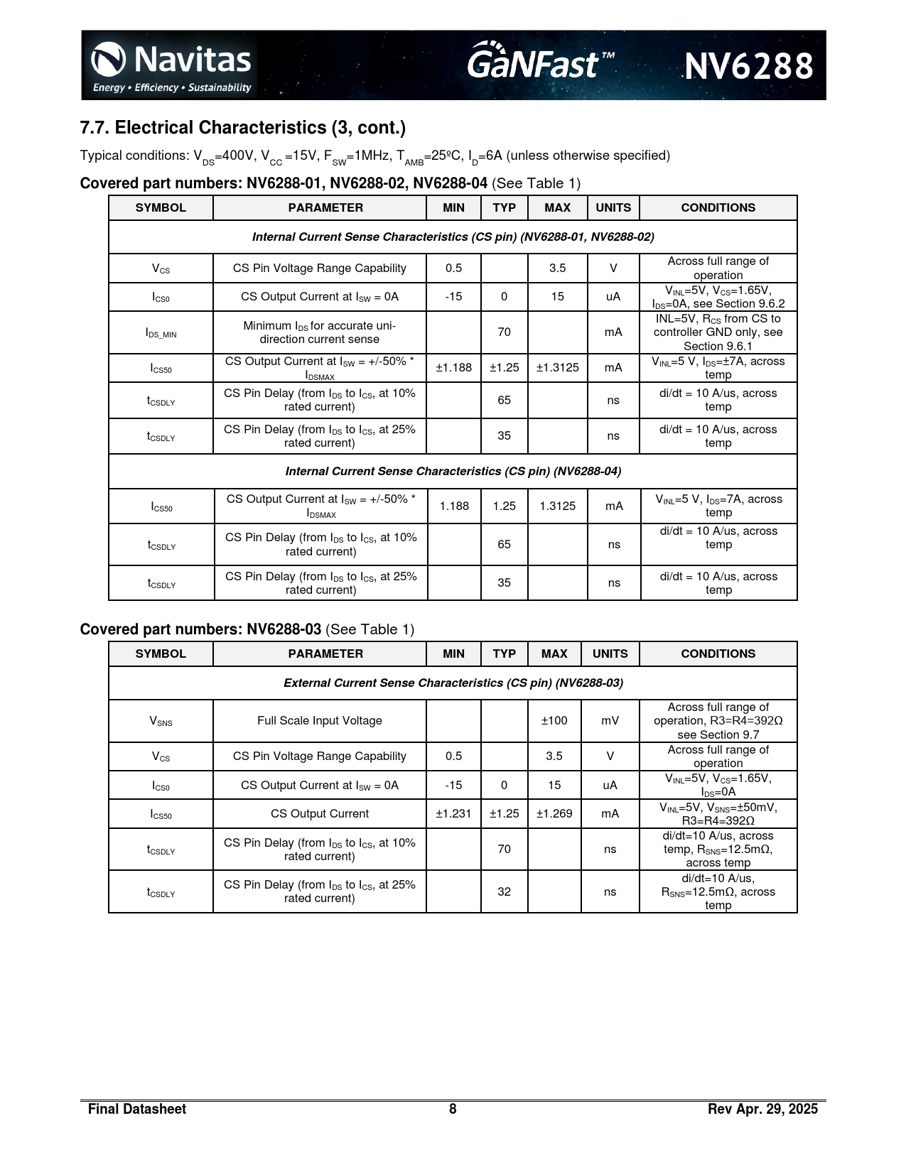 link to page 2 link to page 22 link to page 21 link to page 2 link to page 23 NV62887.7. Electrical Characteristics (3, cont.) Typical conditions: V =400V, V =15V, F =1MHz, T =25ºC, I =6A (unless otherwise specified) DS CC SW AMB D Covered part numbers: NV6288-01, NV6288-02, NV6288-04 (See Table 1) SYMBOLPARAMETERMINTYPMAXUNITSCONDITIONSInternal Current Sense Characteristics (CS pin) (NV6288-01, NV6288-02) Across full range of VCS CS Pin Voltage Range Capability 0.5 3.5 V operation V I INL=5V, VCS=1.65V, CS0 CS Output Current at ISW = 0A -15 0 15 uA IDS=0A, see Section 9.6.2 INL=5V, R Minimum I CS from CS to I DS for accurate uni- DS_MIN 70 mA controller GND only, see direction current sense Section 9.6.1 CS Output Current at I V I SW = +/-50% * INL=5 V, IDS=±7A, across CS50 ±1.188 ±1.25 ±1.3125 mA IDSMAX temp CS Pin Delay (from I di/dt = 10 A/us, across t DS to ICS, at 10% CSDLY 65 ns rated current) temp CS Pin Delay (from I di/dt = 10 A/us, across t DS to ICS, at 25% CSDLY 35 ns rated current) temp Internal Current Sense Characteristics (CS pin) (NV6288-04) CS Output Current at I V I SW = +/-50% * INL=5 V, IDS=7A, across CS50 1.188 1.25 1.3125 mA IDSMAX temp di/dt = 10 A/us, across CS Pin Delay (from I t DS to ICS, at 10% CSDLY 65 ns temp rated current) CS Pin Delay (from I di/dt = 10 A/us, across t DS to ICS, at 25% CSDLY 35 ns rated current) temp Covered part numbers: NV6288-03 (See Table 1) SYMBOLPARAMETERMINTYPMAXUNITSCONDITIONSExternal Current Sense Characteristics (CS pin) (NV6288-03) Across full range of VSNS Full Scale Input Voltage ±100 mV operation, R3=R4=392Ω see Section 9.7 Across full range of VCS CS Pin Voltage Range Capability 0.5 3.5 V operation V I INL=5V, VCS=1.65V, CS0 CS Output Current at ISW = 0A -15 0 15 uA IDS=0A V I INL=5V, VSNS=±50mV, CS50 CS Output Current ±1.231 ±1.25 ±1.269 mA R3=R4=392Ω di/dt=10 A/us, across CS Pin Delay (from I t DS to ICS, at 10% CSDLY 70 ns temp, R rated current) SNS=12.5mΩ, across temp di/dt=10 A/us, CS Pin Delay (from I t DS to ICS, at 25% CSDLY 32 ns R rated current) SNS=12.5mΩ, across temp Final Datasheet8Rev Apr. 29, 2025