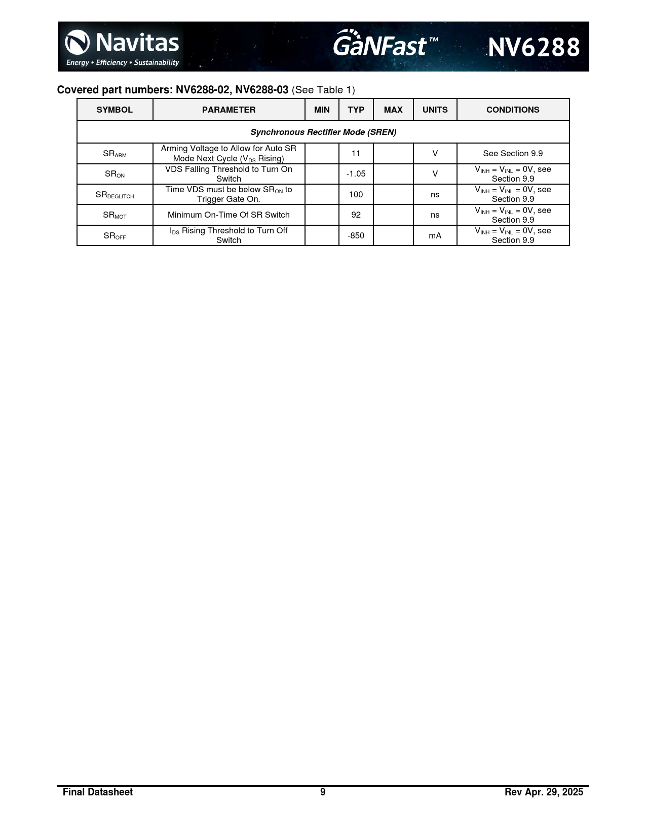 link to page 2 link to page 24 link to page 24 link to page 24 link to page 24 link to page 24 NV6288Covered part numbers: NV6288-02, NV6288-03 (See Table 1) SYMBOLPARAMETERMINTYPMAXUNITSCONDITIONSSynchronous Rectifier Mode (SREN) Arming Voltage to Allow for Auto SR SRARM 11 V See Section 9.9 Mode Next Cycle (VDS Rising) VDS Falling Threshold to Turn On V SR INH = VINL = 0V, see ON -1.05 V Switch Section 9.9 Time VDS must be below SR V SR ON to INH = VINL = 0V, see DEGLITCH 100 ns Trigger Gate On. Section 9.9 V SR INH = VINL = 0V, see MOT Minimum On-Time Of SR Switch 92 ns Section 9.9 I V SR DS Rising Threshold to Turn Off INH = VINL = 0V, see OFF -850 mA Switch Section 9.9 Final Datasheet9Rev Apr. 29, 2025