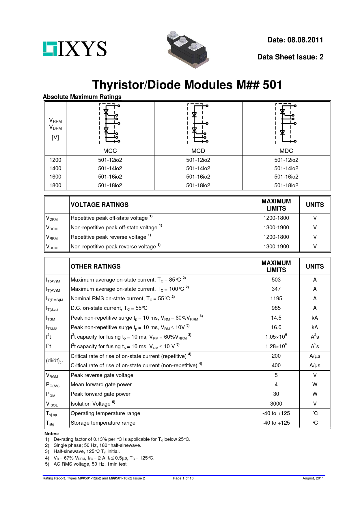 Date: 08.08.2011 IXYS Data Sheet Issue: 2 Thyristor/Diode Modules M## 501 Absolute Maximum Ratings VRRM VDRM [V] MCC MCD MDC 1200 501-12io2 501-12io2 501-12io2 1400 501-14io2 501-14io2 501-14io2 1600 501-16io2 501-16io2 501-16io2 1800 501-18io2 501-18io2 501-18io2 VOLTAGE RATINGS VDRM VDSM VRRM VRSM Repetitive peak off-state voltage 1) Non-repetitive peak off-state voltage Repetitive peak reverse voltage 1) 1) Non-repetitive peak reverse voltage 1) OTHER RATINGS IT(AV)M IT(AV)M Maximum average on-state current, TC = 85°C 2) Maximum average on-state current. TC = 100°C IT(RMS)M Nominal RMS on-state current, TC = 55°C IT(d.c.) D.C. on-state current, TC = 55°C ITSM ITSM2 2 2) 2) UNITS 1200-1800 V 1300-1900 V 1200-1800 V 1300-1900 V MAXIMUM LIMITS UNITS 503 A 347 A 1195 A 985 A Peak non-repetitive surge tp = 10 ms, VRM = 60%VRRM 3) 14.5 kA Peak non-repetitive surge tp = 10 ms, VRM ≤ 10V 16.0 2 3) It I t capacity for fusing tp = 10 ms, VRM = 60%VRRM I2 t I2t capacity for fusing tp = 10 ms, VRM ≤ 10 V 3) (di/dt)cr MAXIMUM LIMITS 3) Critical rate of rise of on-state current (repetitive) 4) Critical rate of rise of on-state current (non-repetitive) 4) kA 6 1.05×10 A2s 1.28×106 A2s 200 A/µs 400 A/µs VRGM Peak reverse gate voltage 5 V PG(AV) Mean forward gate power 4 W PGM Peak forward gate power 30 W 3000 V 5) VISOL Isolation Voltage Tvj op Operating temperature range -40 to +125 °C Tstg Storage temperature range -40 to +125 °C Notes: 1) De-rating factor of 0.13% per °C is applicable for Tvj below 25°C. 2) Single phase; 50 Hz, 180° half-sinewave. 3) Half-sinewave, 125°C Tvj initial. 4) VD = 67% VDRM, IFG = 2 A, tr ≤ 0.5µs, TC = 125°C. 5) AC RMS voltage, 50 Hz, 1min test Rating Report. Types M##501-12io2 and M##501-18io2 Issue 2 Page 1 of 10 August, 2011
