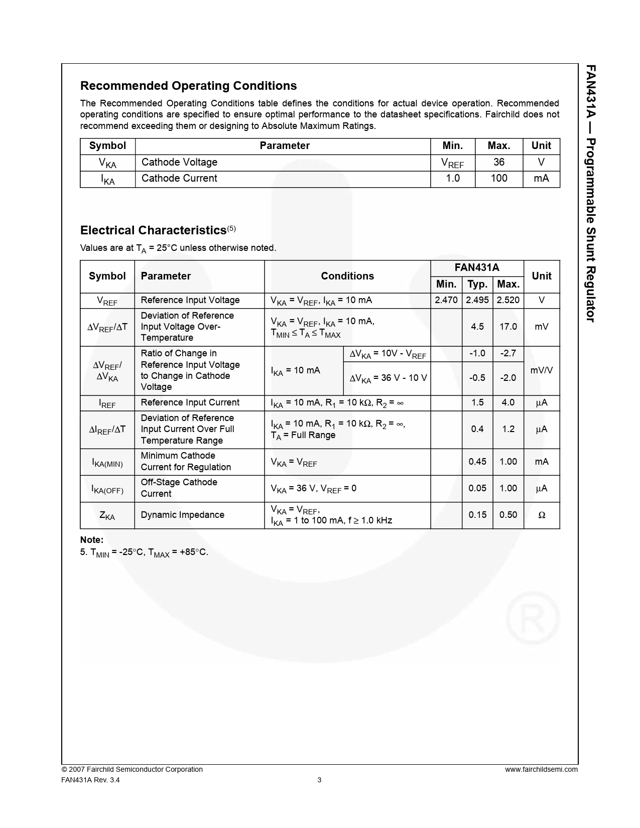 5. TMIN = -25C, TMAX = +85C. © 2007 Fairchild Semiconductor Corporation www.fairchildsemi.com FAN431A Rev. 3.4 3