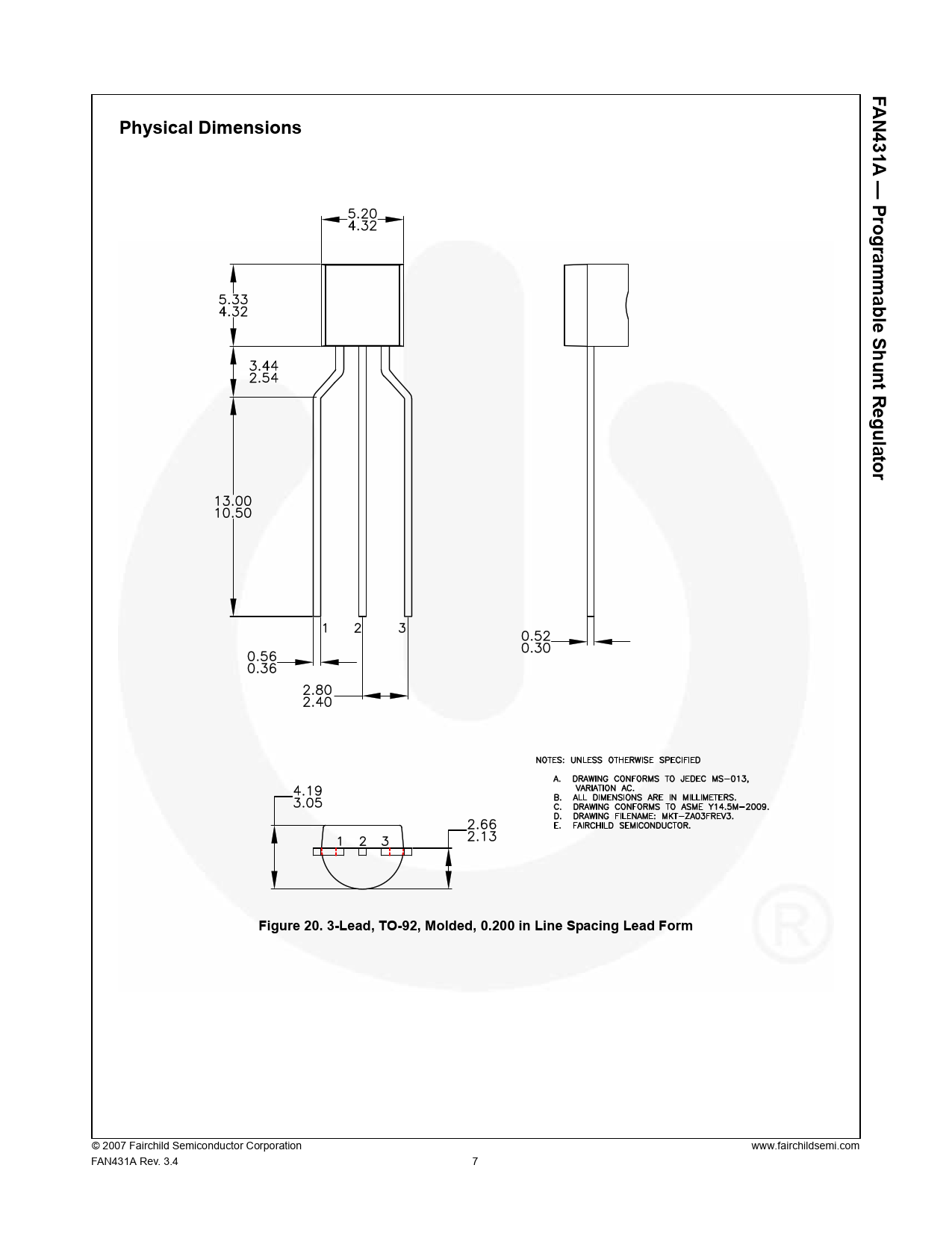 FAN Physical Dimensions 431A — Programmable Shunt Regul ator Figure 20. 3-Lead, TO-92, Molded, 0.200 in Line Spacing Lead Form