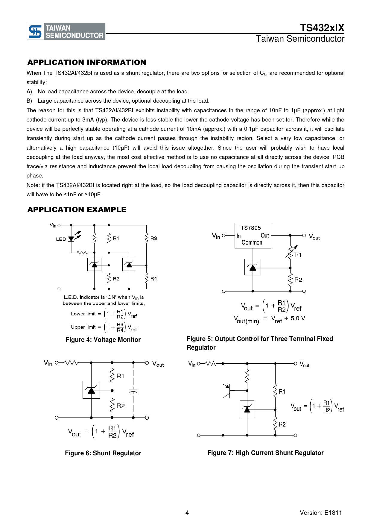 When The TS432AI/432BI is used as a shunt regulator, there are two options for selection of CL, are recommended for optional stability: A) No load capacitance across the device, decouple at the load. B) Large capacitance across the device, optional decoupling at the load. The reason for this is that TS432AI/432BI exhibits instability with capacitances in the range of 10nF to 1µF (approx.) at light cathode current up to 3mA (typ). The device is less stable the lower the cathode voltage has been set for. Therefore while the device will be perfectly stable operating at a cathode current of 10mA (approx.) with a 0.1µF capacitor across it, it will oscillate transiently during start up as the cathode current passes through the instability region. Select a very low capacitance, or alternatively a high capacitance (10µF) will avoid this issue altogether. Since the user will probably wish to have local decoupling at the load anyway, the most cost effective method is to use no capacitance at all directly across the device. PCB trace/via resistance and inductance prevent the local load decoupling from causing the oscillation during the transient start up phase. Note: if the TS432AI/432BI is located right at the load, so the load decoupling capacitor is directly across it, then this capacitor will have to be ≤1nF or ≥10µF.
