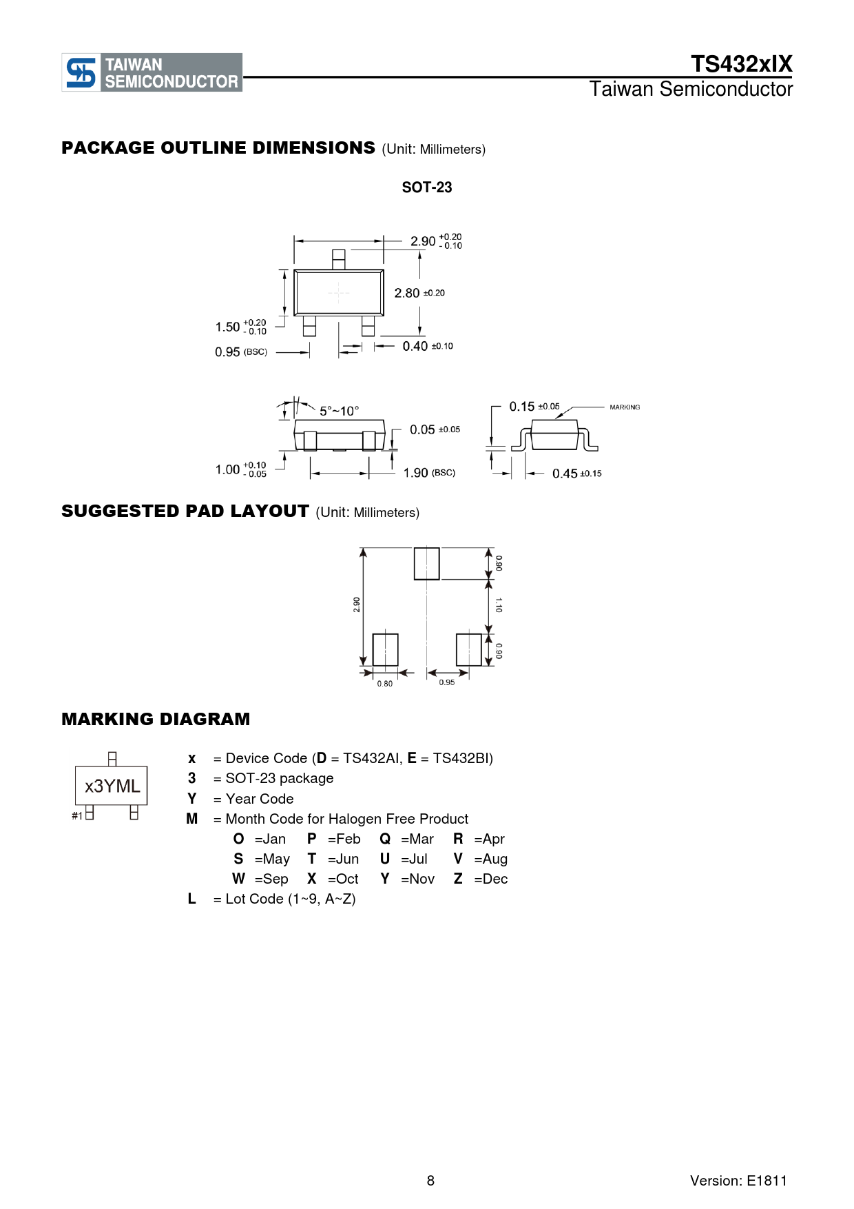 TS432xIX. PACKAGE OUTLINE DIMENSIONS. SOT-23. SUGGESTED PAD LAYOUT. MARKING DIAGRAM
