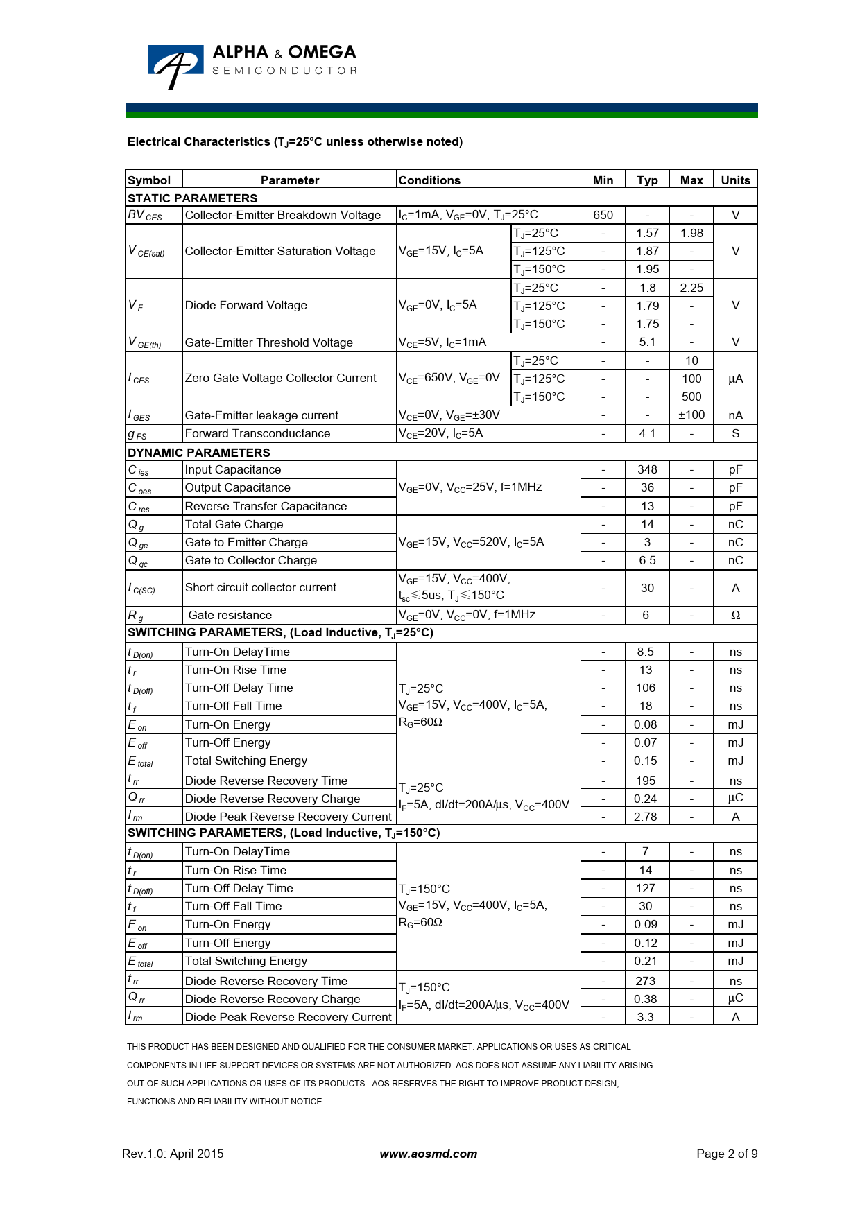 t D(on) Turn-On DelayTime - 7 - ns t r Turn-On Rise Time - 14 - ns t D(off) Turn-Off Delay Time T - 127 - ns J=150°C t Turn-Off Fall Time V f GE=15V, VCC=400V, IC=5A, - 30 - ns E R on Turn-On Energy G=60Ω - 0.09 - mJ E off Turn-Off Energy - 0.12 - mJ E total Total Switching Energy - 0.21 - mJ t rr Diode Reverse Recovery Time - 273 - ns TJ=150°C Q rr Diode Reverse Recovery Charge - 0.38 - µC IF=5A, dI/dt=200A/µs, VCC=400V I rm Diode Peak Reverse Recovery Current - 3.3 - A THIS PRODUCT HAS BEEN DESIGNED AND QUALIFIED FOR THE CONSUMER MARKET. APPLICATIONS OR USES AS CRITICAL COMPONENTS IN LIFE SUPPORT DEVICES OR SYSTEMS ARE NOT AUTHORIZED. AOS DOES NOT ASSUME ANY LIABILITY ARISING OUT OF SUCH APPLICATIONS OR USES OF ITS PRODUCTS. AOS RESERVES THE RIGHT TO IMPROVE PRODUCT DESIGN, FUNCTIONS AND RELIABILITY WITHOUT NOTICE. Rev.1.0: April 2015