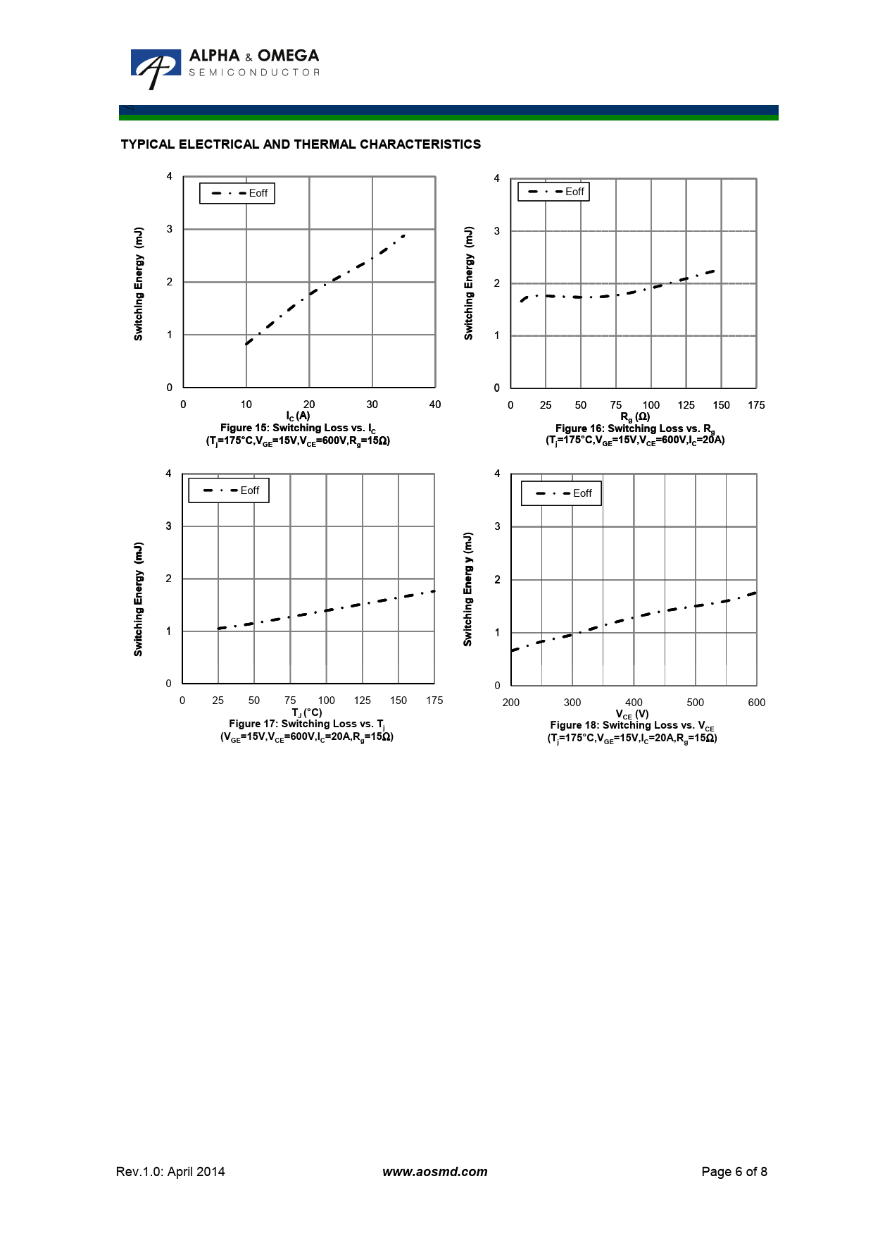 ≤ TYPICAL ELECTRICAL AND THERMAL CHARACTERISTICS 4 4 Eo E ff Eo E ff ) 3 )J 3 JJ 3 (m(myyrgrgeen 2 n 2 2 EEggIninhhitcitcw 1 wS 1 SS 1 0 0 0 10 20 30 40 0 25 50 75 100 125 150 175 I (A)ACCR ( Ω )g Ω gFiF gi ug ru e 15: SwS iw ti chih ni gng LoL so s vsv .. ICFiF gi ug ru e 16: SwS iw ti chih ni gng LoL so s vsv .. RCg(T =1= 75°C,V,=1= 5V,V V,=6= 00V,V R,=1= 5 Ω )(T =175°C,V=15V,V =600V,I =20A)jGECEg Ω )(T =175°C,V=15V,V =600V,I =20AjGECEgjGEGCECC 4 4 Eo E ff Eo E ff 3 3 ))J) J(m(my(m yrg 2 rge 2 rg ene nEEgE gininhin h 1 itc 1 1 itcwwSw S 0 0 0 25 50 75 100 125 150 175 200 300 400 500 600 T (°C)JV(V)CEFigure 17: Switching Loss vs. TjFigure 18: Switching Loss vs. VCE(V=15V,V =600V,I =20A,R =15 Ω )GECECg(T =175°C,V=15V,I =20A,R =15 Ω )jGECg Rev.1.0: April 2014 www.aosmd.com Page 6 of 8