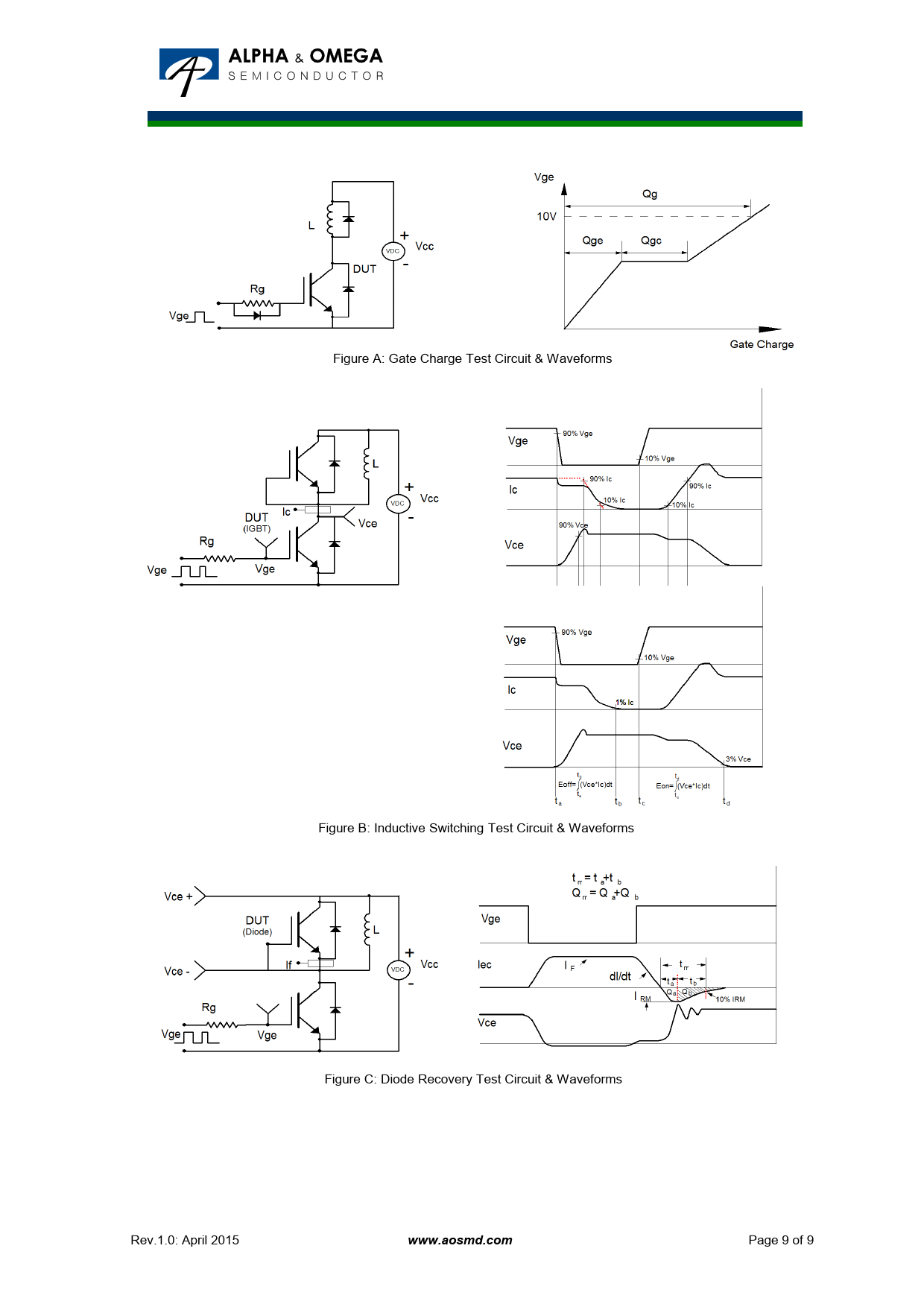 Figure A: Gate Charge Test Circuit & Waveforms Figure B: Inductive Switching Test Circuit & Waveforms Figure C: Diode Recovery Test Circuit & Waveforms Rev.1.0: April 2015