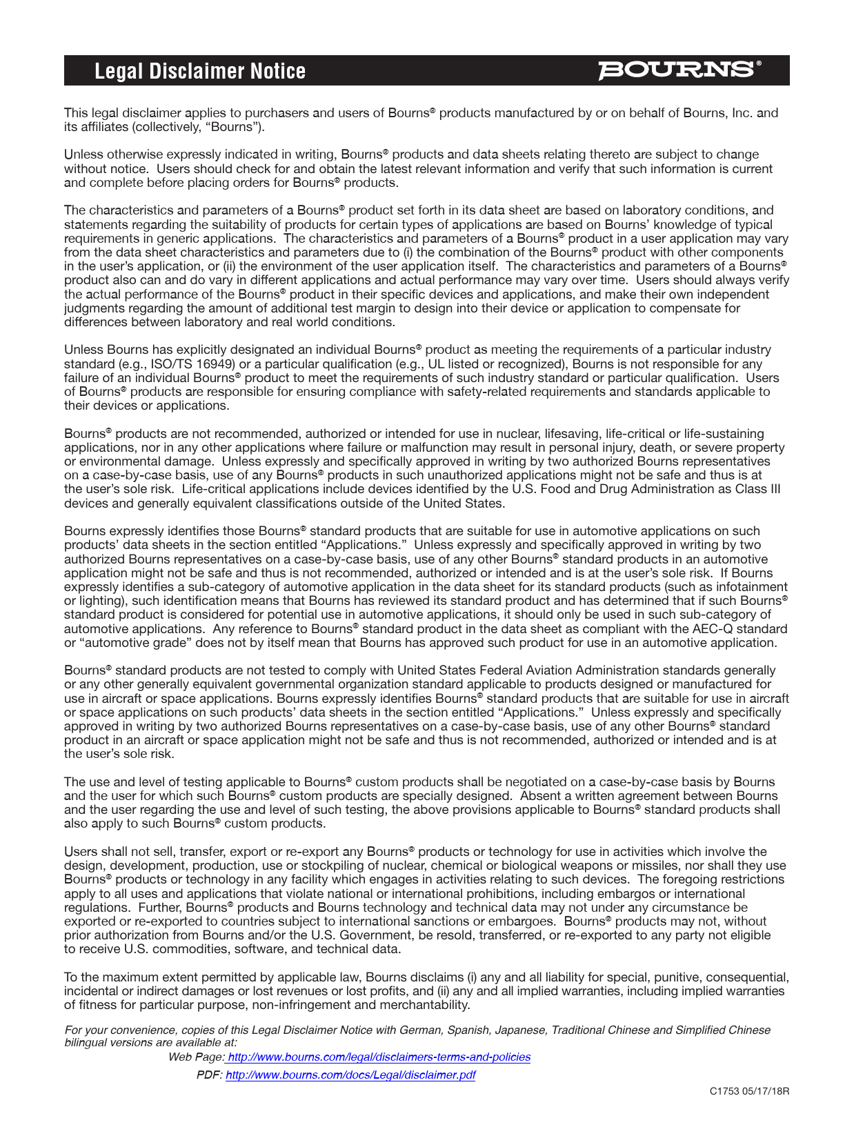 This legal disclaimer applies to purchasers and users of Bourns® products manufactured by or on behalf of Bourns, Inc. and P[ZHɉSPH[LZJVSSLJ[P]LS`¸)V\YUZ¹ Unless otherwise expressly indicated in writing, Bourns® products and data sheets relating thereto are subject to change ^P[OV\[UV[PJL<ZLYZZOV\SKJOLJRMVYHUKVI[HPU[OLSH[LZ[YLSL]HU[PUMVYTH[PVUHUK]LYPM`[OH[Z\JOPUMVYTH[PVUPZJ\YYLU[ and complete before placing orders for Bourns® products. The characteristics and parameters of a Bourns® product set forth in its data sheet are based on laboratory conditions, and statements regarding the suitability of products for certain types of applications are based on Bourns’ knowledge of typical requirements in generic applications. The characteristics and parameters of a Bourns®WYVK\J[PUH\ZLYHWWSPJH[PVUTH`]HY` MYVT[OLKH[HZOLL[JOHYHJ[LYPZ[PJZHUKWHYHTL[LYZK\L[VP[OLJVTIPUH[PVUVM[OL)V\YUZ® product with other components PU[OL\ZLY»ZHWWSPJH[PVUVYPP[OLLU]PYVUTLU[VM[OL\ZLYHWWSPJH[PVUP[ZLSM;OLJOHYHJ[LYPZ[PJZHUKWHYHTL[LYZVMH)V\YUZ® WYVK\J[HSZVJHUHUKKV]HY`PUKPɈLYLU[HWWSPJH[PVUZHUKHJ[\HSWLYMVYTHUJLTH`]HY`V]LY[PTL<ZLYZZOV\SKHS^H`Z]LYPM` the actual performance of the Bourns®WYVK\J[PU[OLPYZWLJPÄJKL]PJLZHUKHWWSPJH[PVUZHUKTHRL[OLPYV^UPUKLWLUKLU[ Q\KNTLU[ZYLNHYKPUN[OLHTV\U[VMHKKP[PVUHS[LZ[THYNPU[VKLZPNUPU[V[OLPYKL]PJLVYHWWSPJH[PVU[VJVTWLUZH[LMVY KPɈLYLUJLZIL[^LLUSHIVYH[VY`HUKYLHS^VYSKJVUKP[PVUZ <USLZZ)V\YUZOHZL_WSPJP[S`KLZPNUH[LKHUPUKP]PK\HS)V\YUZ® product as meeting the requirements of a particular industry Z[HUKHYKLN0:6;: VYHWHY[PJ\SHYX\HSPÄJH[PVULN<3SPZ[LKVYYLJVNUPaLK)V\YUZPZUV[YLZWVUZPISLMVYHU` MHPS\YLVMHUPUKP]PK\HS)V\YUZ®WYVK\J[[VTLL[[OLYLX\PYLTLU[ZVMZ\JOPUK\Z[Y`Z[HUKHYKVYWHY[PJ\SHYX\HSPÄJH[PVU<ZLYZ of Bourns® products are responsible for ensuring compliance with safety-related requirements and standards applicable to [OLPYKL]PJLZVYHWWSPJH[PVUZ Bourns®WYVK\J[ZHYLUV[YLJVTTLUKLKH\[OVYPaLKVYPU[LUKLKMVY\ZLPUU\JSLHYSPMLZH]PUNSPMLJYP[PJHSVYSPMLZ\Z[HPUPUN HWWSPJH[PVUZUVYPUHU`V[OLYHWWSPJH[PVUZ^OLYLMHPS\YLVYTHSM\UJ[PVUTH`YLZ\S[PUWLYZVUHSPUQ\Y`KLH[OVYZL]LYLWYVWLY[` VYLU]PYVUTLU[HSKHTHNL<USLZZL_WYLZZS`HUKZWLJPÄJHSS`HWWYV]LKPU^YP[PUNI`[^VH\[OVYPaLK)V\YUZYLWYLZLU[H[P]LZ on a case-by-case basis, use of any Bourns®WYVK\J[ZPUZ\JO\UH\[OVYPaLKHWWSPJH[PVUZTPNO[UV[ILZHMLHUK[O\ZPZH[ [OL\ZLY»ZZVSLYPZR3PMLJYP[PJHSHWWSPJH[PVUZPUJS\KLKL]PJLZPKLU[PÄLKI`[OL<:-VVKHUK+Y\N(KTPUPZ[YH[PVUHZ*SHZZ000 KL]PJLZHUKNLULYHSS`LX\P]HSLU[JSHZZPÄJH[PVUZV\[ZPKLVM[OL<UP[LK:[H[LZ )V\YUZL_WYLZZS`PKLU[PÄLZ[OVZL)V\YUZ®Z[HUKHYKWYVK\J[Z[OH[HYLZ\P[HISLMVY\ZLPUH\[VTV[P]LHWWSPJH[PVUZVUZ\JO WYVK\J[Z»KH[HZOLL[ZPU[OLZLJ[PVULU[P[SLK¸(WWSPJH[PVUZ¹<USLZZL_WYLZZS`HUKZWLJPÄJHSS`HWWYV]LKPU^YP[PUNI`[^V H\[OVYPaLK)V\YUZYLWYLZLU[H[P]LZVUHJHZLI`JHZLIHZPZ\ZLVMHU`V[OLY)V\YUZ®Z[HUKHYKWYVK\J[ZPUHUH\[VTV[P]L HWWSPJH[PVUTPNO[UV[ILZHMLHUK[O\ZPZUV[YLJVTTLUKLKH\[OVYPaLKVYPU[LUKLKHUKPZH[[OL\ZLY»ZZVSLYPZR0M)V\YUZ L_WYLZZS`PKLU[PÄLZHZ\IJH[LNVY`VMH\[VTV[P]LHWWSPJH[PVUPU[OLKH[HZOLL[MVYP[ZZ[HUKHYKWYVK\J[ZZ\JOHZPUMV[HPUTLU[ VYSPNO[PUNZ\JOPKLU[PÄJH[PVUTLHUZ[OH[)V\YUZOHZYL]PL^LKP[ZZ[HUKHYKWYVK\J[HUKOHZKL[LYTPULK[OH[PMZ\JO)V\YUZ® Z[HUKHYKWYVK\J[PZJVUZPKLYLKMVYWV[LU[PHS\ZLPUH\[VTV[P]LHWWSPJH[PVUZP[ZOV\SKVUS`IL\ZLKPUZ\JOZ\IJH[LNVY`VM H\[VTV[P]LHWWSPJH[PVUZ(U`YLMLYLUJL[V)V\YUZ®Z[HUKHYKWYVK\J[PU[OLKH[HZOLL[HZJVTWSPHU[^P[O[OL(,*8Z[HUKHYK VY¸H\[VTV[P]LNYHKL¹KVLZUV[I`P[ZLSMTLHU[OH[)V\YUZOHZHWWYV]LKZ\JOWYVK\J[MVY\ZLPUHUH\[VTV[P]LHWWSPJH[PVU Bourns®Z[HUKHYKWYVK\J[ZHYLUV[[LZ[LK[VJVTWS`^P[O<UP[LK:[H[LZ-LKLYHS(]PH[PVU(KTPUPZ[YH[PVUZ[HUKHYKZNLULYHSS` VYHU`V[OLYNLULYHSS`LX\P]HSLU[NV]LYUTLU[HSVYNHUPaH[PVUZ[HUKHYKHWWSPJHISL[VWYVK\J[ZKLZPNULKVYTHU\MHJ[\YLKMVY \ZLPUHPYJYHM[VYZWHJLHWWSPJH[PVUZ)V\YUZL_WYLZZS`PKLU[PÄLZ)V\YUZ® standard products that are suitable for use in aircraft VYZWHJLHWWSPJH[PVUZVUZ\JOWYVK\J[Z»KH[HZOLL[ZPU[OLZLJ[PVULU[P[SLK¸(WWSPJH[PVUZ¹<USLZZL_WYLZZS`HUKZWLJPÄJHSS` HWWYV]LKPU^YP[PUNI`[^VH\[OVYPaLK)V\YUZYLWYLZLU[H[P]LZVUHJHZLI`JHZLIHZPZ\ZLVMHU`V[OLY)V\YUZ® standard WYVK\J[PUHUHPYJYHM[VYZWHJLHWWSPJH[PVUTPNO[UV[ILZHMLHUK[O\ZPZUV[YLJVTTLUKLKH\[OVYPaLKVYPU[LUKLKHUKPZH[ the user’s sole risk. ;OL\ZLHUKSL]LSVM[LZ[PUNHWWSPJHISL[V)V\YUZ® custom products shall be negotiated on a case-by-case basis by Bourns and the user for which such Bourns®J\Z[VTWYVK\J[ZHYLZWLJPHSS`KLZPNULK(IZLU[H^YP[[LUHNYLLTLU[IL[^LLU)V\YUZ HUK[OL\ZLYYLNHYKPUN[OL\ZLHUKSL]LSVMZ\JO[LZ[PUN[OLHIV]LWYV]PZPVUZHWWSPJHISL[V)V\YUZ® standard products shall also apply to such Bourns® custom products. Users shall not sell, transfer, export or re-export any Bourns®WYVK\J[ZVY[LJOUVSVN`MVY\ZLPUHJ[P]P[PLZ^OPJOPU]VS]L[OL KLZPNUKL]LSVWTLU[WYVK\J[PVU\ZLVYZ[VJRWPSPUNVMU\JSLHYJOLTPJHSVYIPVSVNPJHS^LHWVUZVYTPZZPSLZUVYZOHSS[OL`\ZL Bourns®WYVK\J[ZVY[LJOUVSVN`PUHU`MHJPSP[`^OPJOLUNHNLZPUHJ[P]P[PLZYLSH[PUN[VZ\JOKL]PJLZ;OLMVYLNVPUNYLZ[YPJ[PVUZ HWWS`[VHSS\ZLZHUKHWWSPJH[PVUZ[OH[]PVSH[LUH[PVUHSVYPU[LYUH[PVUHSWYVOPIP[PVUZPUJS\KPUNLTIHYNVZVYPU[LYUH[PVUHS YLN\SH[PVUZ-\Y[OLY)V\YUZ® products and Bourns technology and technical data may not under any circumstance be exported or re-exported to countries subject to international sanctions or embargoes. Bourns® products may not, without WYPVYH\[OVYPaH[PVUMYVT)V\YUZHUKVY[OL<:.V]LYUTLU[ILYLZVSK[YHUZMLYYLKVYYLL_WVY[LK[VHU`WHY[`UV[LSPNPISL [VYLJLP]L<:JVTTVKP[PLZZVM[^HYLHUK[LJOUPJHSKH[H ;V[OLTH_PT\TL_[LU[WLYTP[[LKI`HWWSPJHISLSH^)V\YUZKPZJSHPTZPHU`HUKHSSSPHIPSP[`MVYZWLJPHSW\UP[P]LJVUZLX\LU[PHS PUJPKLU[HSVYPUKPYLJ[KHTHNLZVYSVZ[YL]LU\LZVYSVZ[WYVÄ[ZHUKPPHU`HUKHSSPTWSPLK^HYYHU[PLZPUJS\KPUNPTWSPLK^HYYHU[PLZ VMÄ[ULZZMVYWHY[PJ\SHYW\YWVZLUVUPUMYPUNLTLU[HUKTLYJOHU[HIPSP[` )RU\RXUFRQYHQLHQFHFRSLHVRIWKLV/HJDO'LVFODLPHU1RWLFHZLWK*HUPDQ6SDQLVK-DSDQHVH7UDGLWLRQDO&KLQHVHDQG6LPSOLÀHG&KLQHVH bilingual versions are available at: Web Page: http://www.bourns.com/legal/disclaimers-terms-and-policies PDF: http://www.bourns.com/docs/Legal/disclaimer.pdf *9