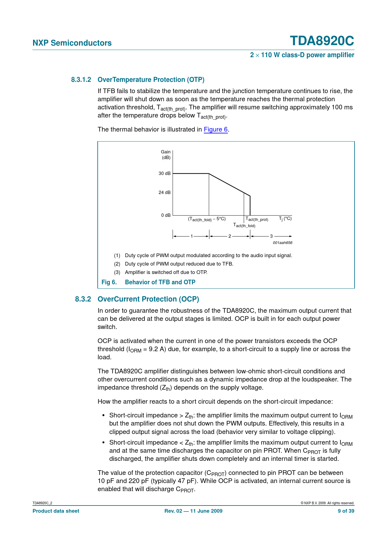 NXP Semiconductors. TDA8920C. 110 W class-D power amplifier. 8.3.1.2. OverTemperature Protection (OTP). Fig 6