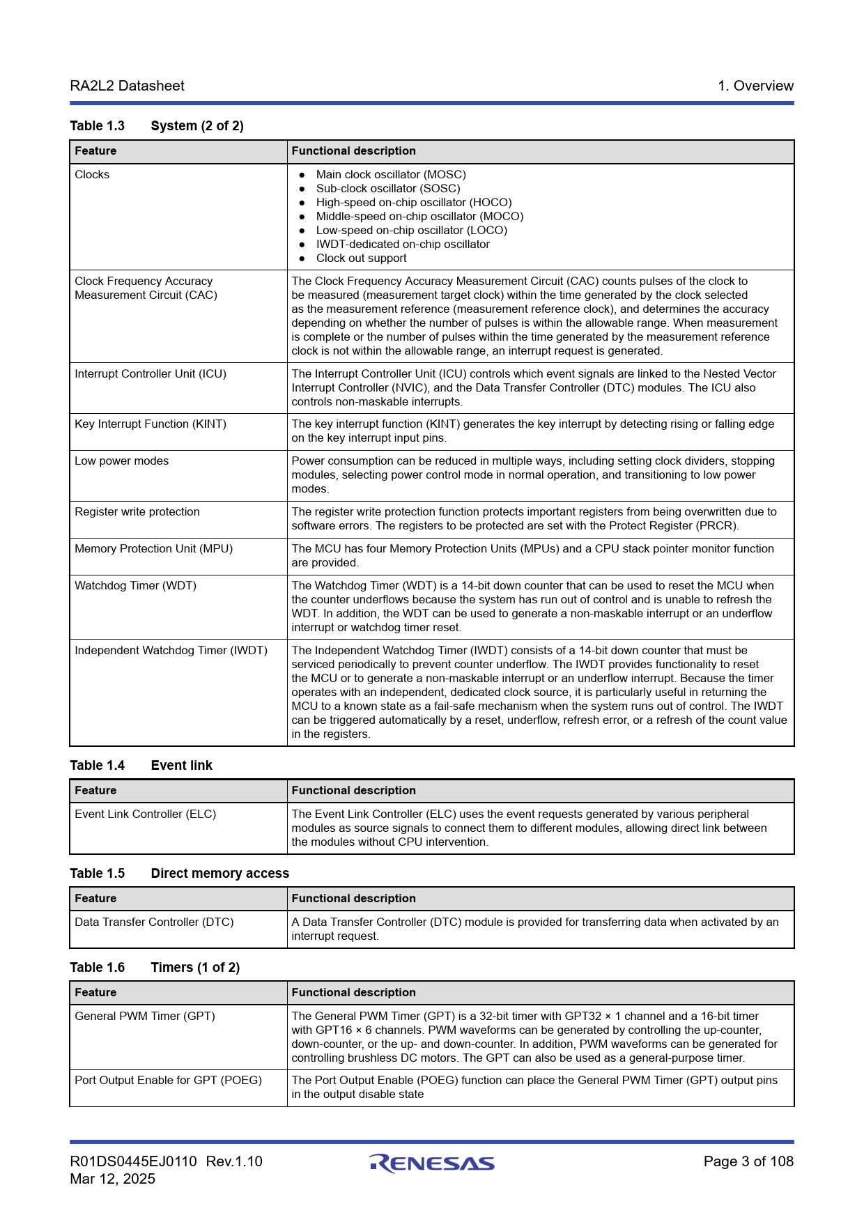 Table 1.3. System (2 of 2). Feature. Functional description. Table 1.4. Event link. Table 1.5. Direct memory access. Table 1.6