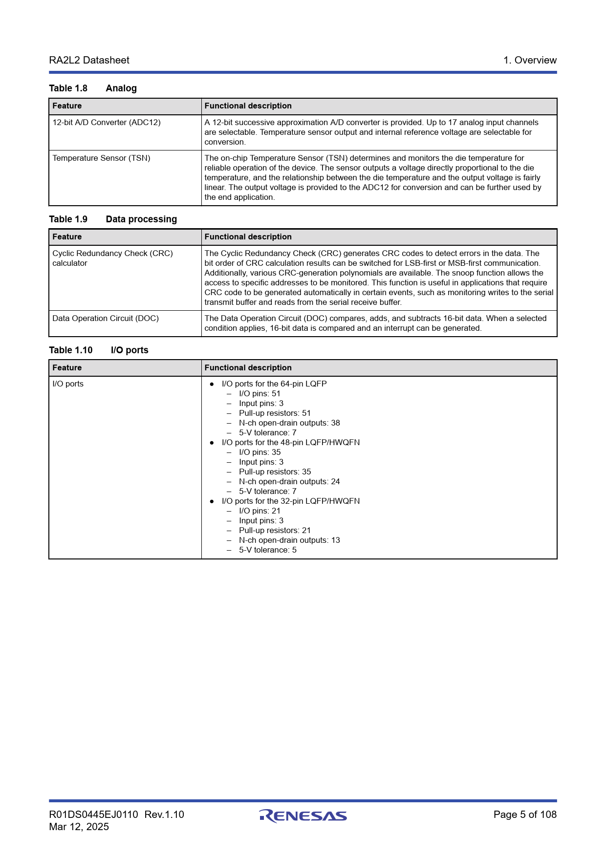 Table 1.8. Analog. Feature. Functional description. Table 1.9. Data processing. Table 1.10. I/O ports