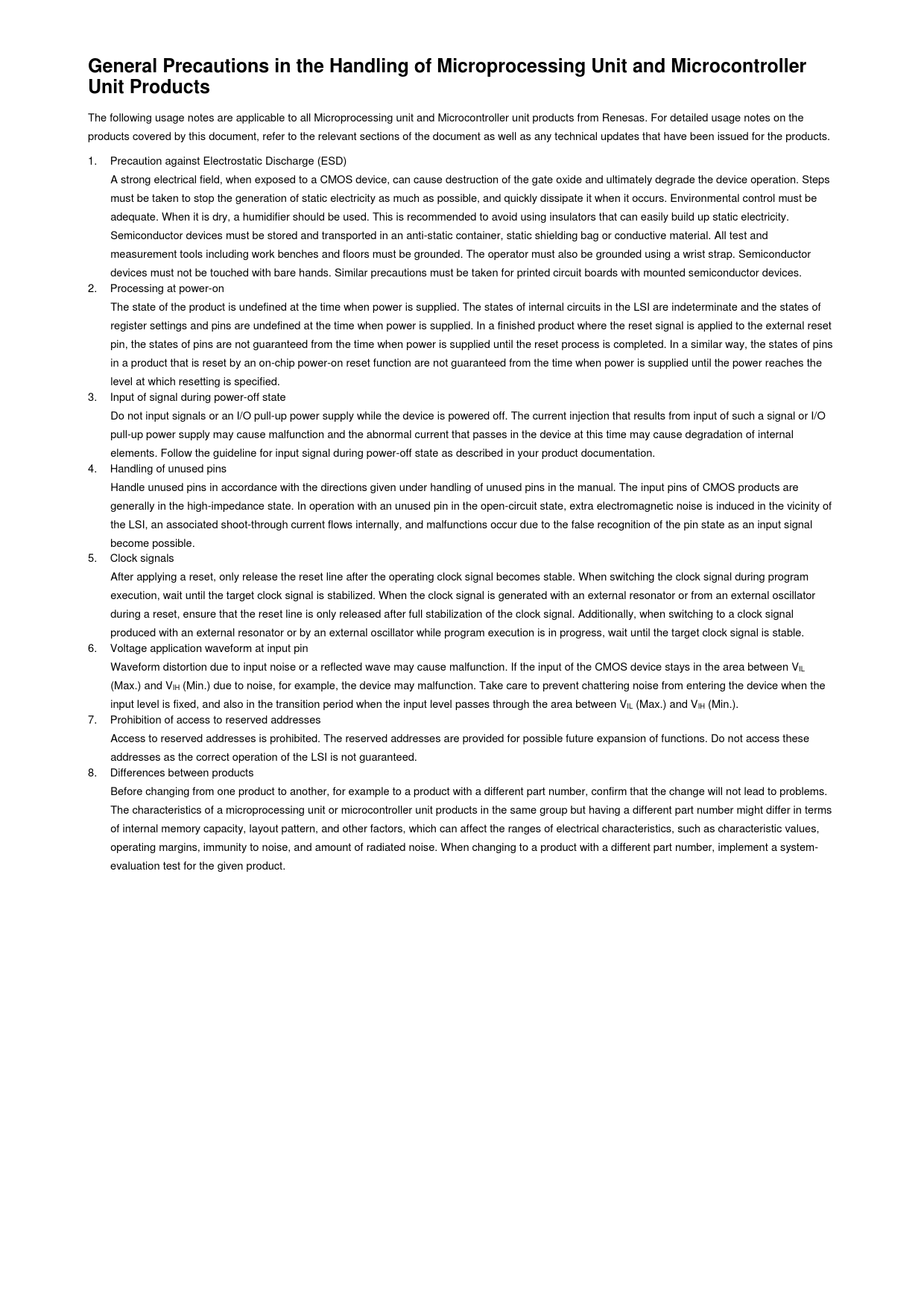 General Precautions in the Handling of Microprocessing Unit and Microcontroller Unit Products The following usage notes are applicable to all Microprocessing unit and Microcontroller unit products from Renesas. For detailed usage notes on the products covered by this document, refer to the relevant sections of the document as well as any technical updates that have been issued for the products. 1. Precaution against Electrostatic Discharge (ESD) A strong electrical field, when exposed to a CMOS device, can cause destruction of the gate oxide and ultimately degrade the device operation. Steps must be taken to stop the generation of static electricity as much as possible, and quickly dissipate it when it occurs. Environmental control must be adequate. When it is dry, a humidifier should be used. This is recommended to avoid using insulators that can easily build up static electricity. Semiconductor devices must be stored and transported in an anti-static container, static shielding bag or conductive material. All test and measurement tools including work benches and floors must be grounded. The operator must also be grounded using a wrist strap. Semiconductor devices must not be touched with bare hands. Similar precautions must be taken for printed circuit boards with mounted semiconductor devices. 2. Processing at power-on The state of the product is undefined at the time when power is supplied. The states of internal circuits in the LSI are indeterminate and the states of register settings and pins are undefined at the time when power is supplied. In a finished product where the reset signal is applied to the external reset pin, the states of pins are not guaranteed from the time when power is supplied until the reset process is completed. In a similar way, the states of pins in a product that is reset by an on-chip power-on reset function are not guaranteed from the time when power is supplied until the power reaches the level at which resetting is specified. 3. Input of signal during power-off state Do not input signals or an I/O pull-up power supply while the device is powered off. The current injection that results from input of such a signal or I/O pull-up power supply may cause malfunction and the abnormal current that passes in the device at this time may cause degradation of internal elements. Follow the guideline for input signal during power-off state as described in your product documentation. 4. Handling of unused pins Handle unused pins in accordance with the directions given under handling of unused pins in the manual. The input pins of CMOS products are generally in the high-impedance state. In operation with an unused pin in the open-circuit state, extra electromagnetic noise is induced in the vicinity of the LSI, an associated shoot-through current flows internally, and malfunctions occur due to the false recognition of the pin state as an input signal become possible. 5. Clock signals After applying a reset, only release the reset line after the operating clock signal becomes stable. When switching the clock signal during program execution, wait until the target clock signal is stabilized. When the clock signal is generated with an external resonator or from an external oscillator during a reset, ensure that the reset line is only released after full stabilization of the clock signal. Additionally, when switching to a clock signal produced with an external resonator or by an external oscillator while program execution is in progress, wait until the target clock signal is stable. 6. Voltage application waveform at input pin Waveform distortion due to input noise or a reflected wave may cause malfunction. If the input of the CMOS device stays in the area between VIL (Max.) and VIH (Min.) due to noise, for example, the device may malfunction. Take care to prevent chattering noise from entering the device when the input level is fixed, and also in the transition period when the input level passes through the area between VIL (Max.) and VIH (Min.). 7. Prohibition of access to reserved addresses Access to reserved addresses is prohibited. The reserved addresses are provided for possible future expansion of functions. Do not access these addresses as the correct operation of the LSI is not guaranteed. 8. Differences between products Before changing from one product to another, for example to a product with a different part number, confirm that the change will not lead to problems. The characteristics of a microprocessing unit or microcontroller unit products in the same group but having a different part number might differ in terms of internal memory capacity, layout pattern, and other factors, which can affect the ranges of electrical characteristics, such as characteristic values, operating margins, immunity to noise, and amount of radiated noise. When changing to a product with a different part number, implement a system- evaluation test for the given product. Document Outline Cover Notice General Precautions Preface Contents Features 1. Overview 1.1 Function Outline 1.2 Block Diagram 1.3 Part Numbering 1.4 Function Comparison 1.5 Pin Functions 1.6 Pin Assignments 1.7 Pin Lists 2. CPU 2.1 Overview 2.1.1 CPU 2.1.2 Debug 2.1.3 Operating Frequency 2.1.4 Block Diagram 2.2 Implementation Options 2.3 SWD Interface 2.4 Debug Function 2.4.1 Debug Mode Definition 2.4.2 Debug Mode Effects 2.4.2.1 Low power mode 2.4.2.2 Reset 2.5 Programmers Model 2.5.1 Address Spaces 2.5.2 Cortex-M23 Peripheral Address Map 2.5.3 External Debug Address Map 2.5.4 CoreSight ROM Table 2.5.4.1 ROM entries 2.5.4.2 CoreSight component registers 2.5.5 DBGREG Module 2.5.5.1 DBGSTR : Debug Status Register 2.5.5.2 DBGSTOPCR : Debug Stop Control Register 2.5.5.3 DBGREG CoreSight component registers 2.5.6 OCDREG Module 2.5.6.1 IAUTHn : ID Authentication Code Register (n = 0 to 3) 2.5.6.2 MCUSTAT : MCU Status Register 2.5.6.3 MCUCTRL : MCU Control Register 2.5.6.4 OCDREG CoreSight component registers 2.6 SysTick T