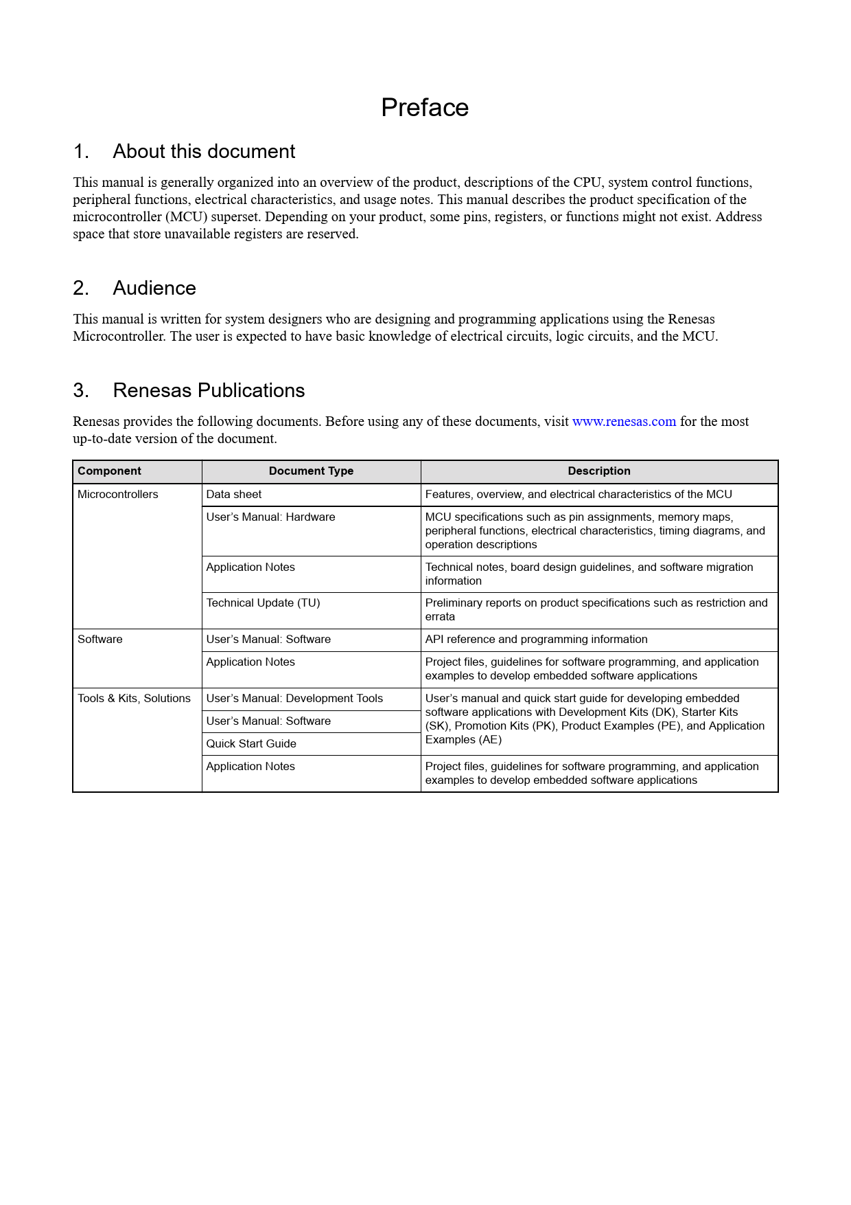 Preface 1. About this document This manual is generally organized into an overview of the product, descriptions of the CPU, system control functions, peripheral functions, electrical characteristics, and usage notes. This manual describes the product specification of the microcontroller (MCU) superset. Depending on your product, some pins, registers, or functions might not exist. Address space that store unavailable registers are reserved. 2. Audience This manual is written for system designers who are designing and programming applications using the Renesas Microcontroller. The user is expected to have basic knowledge of electrical circuits, logic circuits, and the MCU. 3. Renesas Publications Renesas provides the following documents. Before using any of these documents, visit www.renesas.com for the most up-to-date version of the document. ComponentDocument TypeDescription Microcontrollers Data sheet Features, overview, and electrical characteristics of the MCU User’s Manual: Hardware MCU specifications such as pin assignments, memory maps, peripheral functions, electrical characteristics, timing diagrams, and operation descriptions Application Notes Technical notes, board design guidelines, and software migration information Technical Update (TU) Preliminary reports on product specifications such as restriction and errata Software User’s Manual: Software API reference and programming information Application Notes Project files, guidelines for software programming, and application examples to develop embedded software applications Tools & Kits, Solutions User’s Manual: Development Tools User’s manual and quick start guide for developing embedded software applications with Development Kits (DK), Starter Kits User’s Manual: Software (SK), Promotion Kits (PK), Product Examples (PE), and Application Examples (AE) Quick Start Guide Application Notes Project files, guidelines for software programming, and application examples to develop embedded software applications Document Outline Cover Notice General Precautions Preface Contents Features 1. Overview 1.1 Function Outline 1.2 Block Diagram 1.3 Part Numbering 1.4 Function Comparison 1.5 Pin Functions 1.6 Pin Assignments 1.7 Pin Lists 2. CPU 2.1 Overview 2.1.1 CPU 2.1.2 Debug 2.1.3 Operating Frequency 2.1.4 Block Diagram 2.2 Implementation Options 2.3 SWD Interface 2.4 Debug Function 2.4.1 Debug Mode Definition 2.4.2 Debug Mode Effects 2.4.2.1 Low power mode 2.4.2.2 Reset 2.5 Programmers Model 2.5.1 Address Spaces 2.5.2 Cortex-M23 Peripheral Address Map 2.5.3 External Debug Address Map 2.5.4 CoreSight ROM Table 2.5.4.1 ROM entries 2.5.4.2 CoreSight component registers 2.5.5 DBGREG Module 2.5.5.1 DBGSTR : Debug Status Register 2.5.5.2 DBGSTOPCR : Debug Stop Control Register 2.5.5.3 DBGREG CoreSight component registers 2.5.6 OCDREG Module 2.5.6.1 IAUTHn : ID Authentication Code Register (n = 0 to 3) 2.5.6.2 MCUSTAT : MCU Status Register 2.5.6.3 MCUCTRL : MCU Control Register 2.5.6.4 OCDREG CoreSight component registers 2.6 SysTick Timer 2.7 OCD Emulator Connection 2.7.1 Unlock ID Code 2.7.2 DBGEN 2.7.3 Restrictions on Connecting an OCD emulator 2.7.3.1 Starting connection while in low power mode 2.7.3.2 Changing low power mode while in OCD mode 2.7.3.3 Modify the unlock ID code in OSIS 2.7.3.4 Connecting sequence and SWD authentication 2.8 References 2.9 Usage Notes 3. Operating Modes 3.1 Operating Mode Types and Selection 3.2 Details of Operating Modes 3.2.1 Single-Chip Mode 3.2.2 SCI Boot Mode or I2C Boot Mode 3.3 Operating Modes Transitions 3.3.1 Operating Mode Transitions as Determined by the Mode-Setting Pin 4. Address Space 4.1 Address Space 5. Resets 5.1 Overview 5.2 Register Descriptions 5.2.1 RSTSR0 : Reset Status Register 0 5.2.2 RSTSR1 : Reset Status Register 1 5.2.3 RSTSR2 : Reset Status Register 2 5.3 Operation 5.3.1 RES Pin Reset 5.3.2 Power-On Reset 5.3.3 Voltage Monitor Reset 5.3.4 Independent Watchdog Timer Reset 5.3.5 Watchdog Timer Reset 5.3.6 Software Reset 5.3.7 Determination of Cold/Warm Start 5.3.8 Determination of Reset Generation Source 5.4 Usage Notes 5.4.1 Note on RES pin reset 6. Option-Setting Memory 6.1 Overview 6.2 Register Descriptions 6.2.1 OFS0 : Option Function Select Register 0 6.2.2 OFS1 : Option Function Select Register 1 6.2.3 MPU Registers 6.2.4 AWS : Access Window Setting Register 6.2.5 OSIS : OCD/Serial Programmer ID Setting Register 6.3 Setting Option-Setting Memory 6.3.1 Allocation of Data in Option-Setting Memory 6.3.2 Setting Data for Programming Option-Setting Memory 6.4 Usage Notes 6.4.1 Data for Programming Reserved Areas and Reserved Bits in the Option-Setting Memory 6.4.2 Note on FSPR Bit 7. Low Voltage Detection (LVD) 7.1 Overview 7.2 Register Descriptions 7.2.1 LVCMPCR : Voltage Monitor Circuit Control Register 7.2.2 LVDLVLR : Voltage Detection Level Select Register 7.2.3 LVD1CR0 : Voltage Monitor 1 Circuit Control Register 0 7.2.4 LVD2CR0 : Voltage Monitor 2 Circuit Control Register 0 7.2.5 LVD1CR1 : Voltage Monitor 1 Circuit Control Register 7.2.6 LVD1SR : Voltage Monitor 1 Circuit Status Register 7.2.7 LVD2CR1 : Voltage Monitor 2 Circuit Control Register 1 7.2.8 LVD2SR : Voltage Monitor 2 Circuit Status Register 7.3 VCC Input Voltage Monitor 7.3.1 Monitoring Vdet0 7.3.2 Monitoring Vdet1 7.3.3 Monitoring Vdet2 7.4 Reset from Voltage Monitor 0 7.5 Interrupt and Reset from Voltage Monitor 1 7.6 Interrupt and Reset from Voltage Monitor 2 7.7 Event Link Controller (ELC) Output 7.7.1 Interrupt Handling and Event Linking 8. Clock Generation Circuit 8.1 Overview 8.2 Register Descriptions 8.2.1 SCKDIVCR : System Clock Division Control Register 8.2.2 SCKSCR : System Clock Source Control Register 8.2.3 MEMWAIT : Memory Wait Cycle Control Register for Code Flash 8.2.4 FLDWAITR : Memory Wait Cycle Control Register for Data Flash 8.2.5 MOSCCR : Main Clock Oscillator Control Register 8.2.6 SOSCCR : Sub-Clock Oscillator Control Register 8.2.7 LOCOCR : Low-Speed On-Chip Oscillator Control Regist