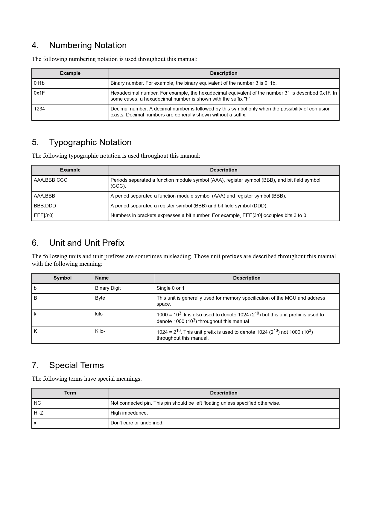 b Binary Digit Single 0 or 1 B Byte This unit is generally used for memory specification of the MCU and address space. k kilo- 1000 = 103. k is also used to denote 1024 (210) but this unit prefix is used to denote 1000 (103) throughout this manual. K Kilo- 1024 = 210. This unit prefix is used to denote 1024 (210) not 1000 (103) throughout this manual. 7. Special Terms The following terms have special meanings.