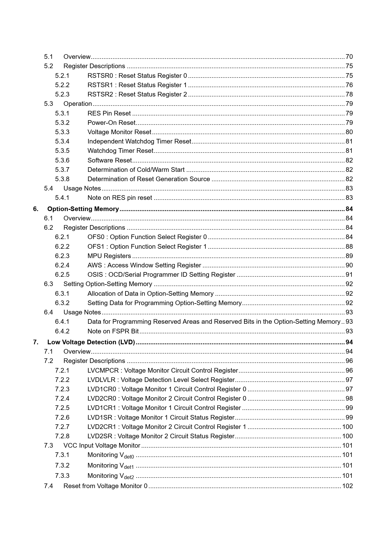 link to page 70 link to page 70 link to page 70 link to page 75 link to page 75 link to page 75 link to page 75 link to page 75 link to page 75 link to page 76 link to page 76 link to page 76 link to page 78 link to page 78 link to page 78 link to page 79 link to page 79 link to page 79 link to page 79 link to page 79 link to page 79 link to page 79 link to page 79 link to page 79 link to page 80 link to page 80 link to page 80 link to page 81 link to page 81 link to page 81 link to page 81 link to page 81 link to page 81 link to page 82 link to page 82 link to page 82 link to page 82 link to page 82 link to page 82 link to page 82 link to page 82 link to page 82 link to page 83 link to page 83 link to page 83 link to page 83 link to page 83 link to page 83 link to page 84 link to page 84 link to page 84 link to page 84 link to page 84 link to page 84 link to page 84 link to page 84 link to page 84 link to page 84 link to page 84 link to page 84 link to page 88 link to page 88 link to page 88 link to page 89 link to page 89 link to page 89 link to page 90 link to page 90 link to page 90 link to page 91 link to page 91 link to page 91 link to page 92 link to page 92 link to page 92 link to page 92 link to page 92 link to page 92 link to page 92 link to page 92 link to page 92 link to page 93 link to page 93 link to page 93 link to page 93 link to page 93 link to page 93 link to page 93 link to page 93 link to page 93 link to page 94 link to page 94 link to page 94 link to page 94 link to page 94 link to page 94 link to page 96 link to page 96 link to page 96 link to page 96 link to page 96 link to page 96 link to page 97 link to page 97 link to page 97 link to page 97 link to page 97 link to page 97 link to page 98 link to page 98 link to page 98 link to page 99 link to page 99 link to page 99 link to page 99 link to page 99 link to page 99 link to page 100 link to page 100 link to page 100 link to page 100 link to page 100 link to page 100 link to page 101 link to page 101 link to page 101 link to page 101 link to page 101 link to page 101 link to page 101 link to page 101 link to page 101 link to page 101 link to page 101 link to page 101 link to page 102 link to page 102 link to page 102 5.1 Overview... 70 5.2 Register Descriptions ... 75 5.2.1 RSTSR0 : Reset Status Register 0 ... 75 5.2.2 RSTSR1 : Reset Status Register 1 ... 76 5.2.3 RSTSR2 : Reset Status Register 2 ... 78 5.3 Operation.. 79 5.3.1 RES Pin Reset .. 79 5.3.2 Power-On Reset.. 79 5.3.3 Voltage Monitor Reset... 80 5.3.4 Independent Watchdog Timer Reset... 81 5.3.5 Watchdog Timer Reset.. 81 5.3.6 Software Reset.. 82 5.3.7 Determination of Cold/Warm Start .. 82 5.3.8 Determination of Reset Generation Source .. 82 5.4 Usage Notes... 83 5.4.1 Note on RES pin reset .. 83