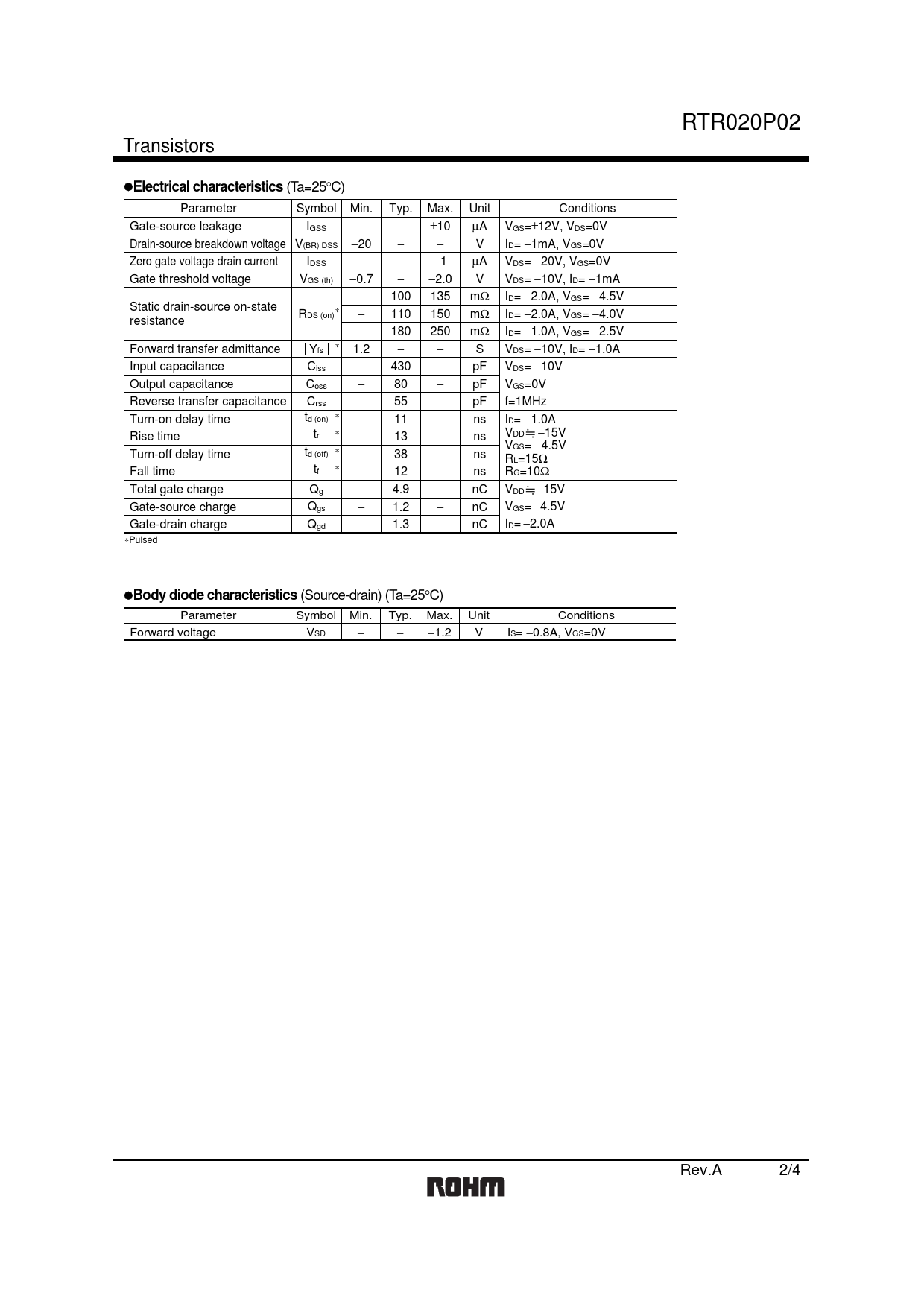 (Source-drain) (Ta=25°C) Parameter Symbol Min. Typ. Max. Unit Conditions Forward voltage VSD − − −1.2 V IS= −0.8A, VGS=0V Rev.A 2/4 Document Outline 2.5V Drive Pch MOS FET RTR020P02