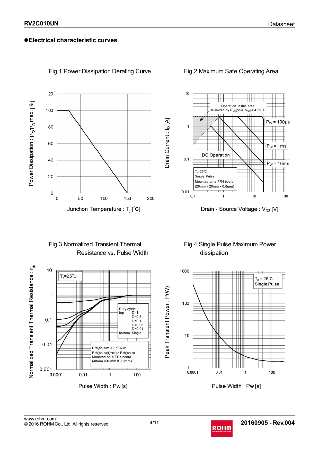 Fig.1 Power Dissipation Derating Curve Fig.2 Maximum Safe Operating Area Fig.3 Normalized Transient Thermal Fig.4 Single Pulse Maximum Power Resistance vs. Pulse Width dissipation www.rohm.com © 2016 ROHM Co., Ltd. All rights reserved. 4/11