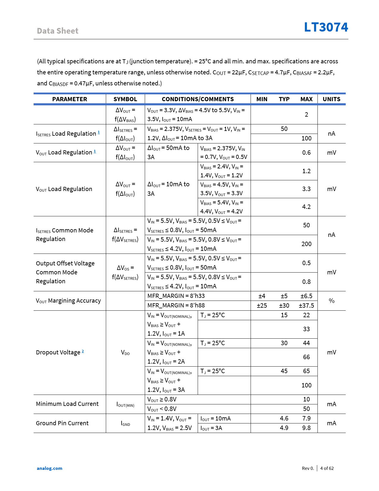 | Seiten / Seite | 62 / 4 — Data Sheet. LT3074. PARAMETER. SYMBOL. CONDITIONS/COMMENTS. MIN. TYP. … |