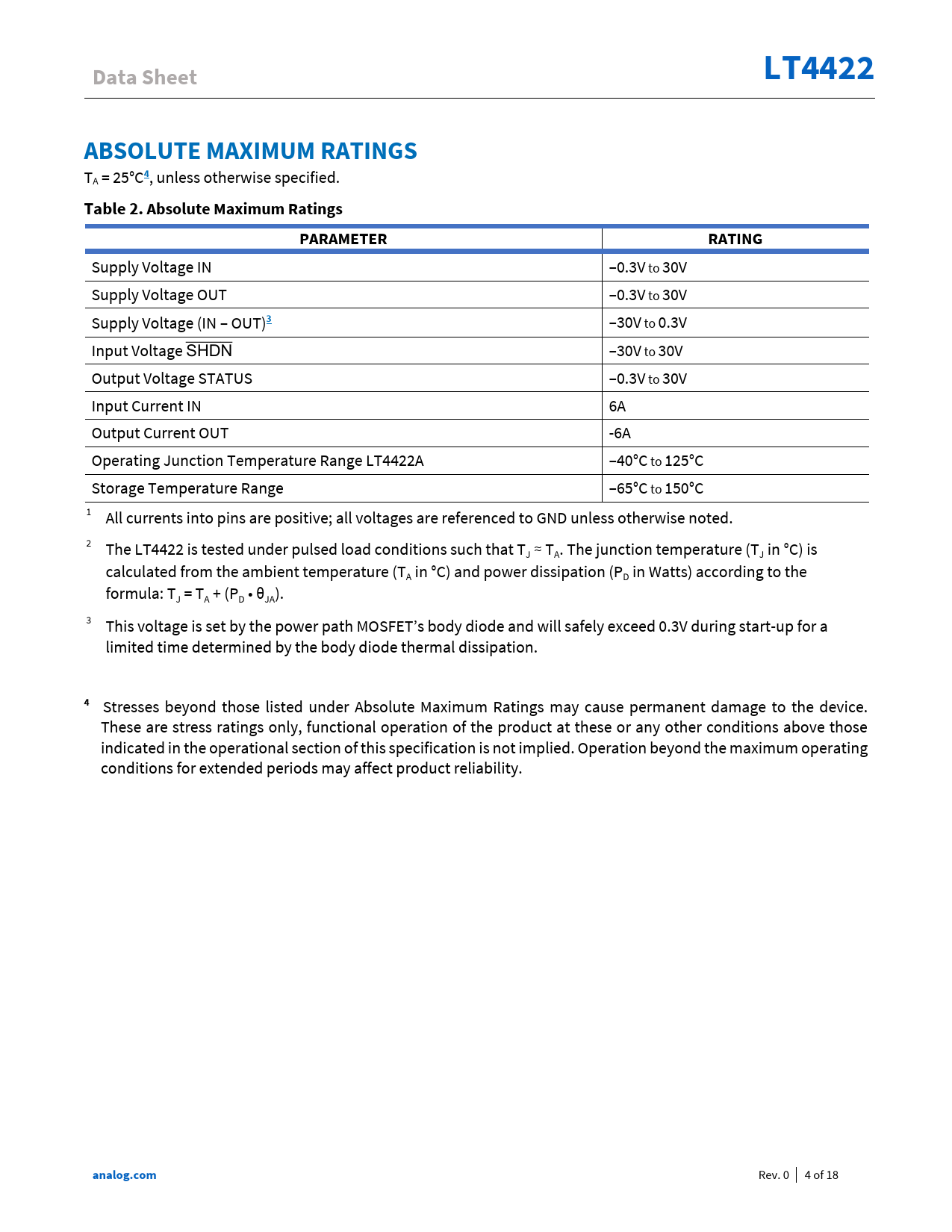 link to page 4 link to page 4 Data SheetLT4422ABSOLUTE MAXIMUM RATINGS TA = 25°C 4 , unless otherwise specified. Table 2. Absolute Maximum RatingsPARAMETERRATING Supply Voltage IN –0.3V to 30V Supply Voltage OUT –0.3V to 30V Supply Voltage (IN – OUT) 3 –30V to 0.3V Input Voltage SHDN –30V to 30V Output Voltage STATUS –0.3V to 30V Input Current IN 6A Output Current OUT -6A Operating Junction Temperature Range LT4422A –40°C to 125°C Storage Temperature Range –65°C to 150°C .1 All currents into pins are positive; all voltages are referenced to GND unless otherwise noted. 2 The LT4422 is tested under pulsed load conditions such that TJ ≈ TA. The junction temperature (TJ in °C) is calculated from the ambient temperature (TA in °C) and power dissipation (PD in Watts) according to the formula: TJ = TA + (PD • θJA). 3 This voltage is set by the power path MOSFET’s body diode and will safely exceed 0.3V during start-up for a limited time determined by the body diode thermal dissipation. 4 Stresses beyond those listed under Absolute Maximum Ratings may cause permanent damage to the device. These are stress ratings only, functional operation of the product at these or any other conditions above those indicated in the operational section of this specification is not implied. Operation beyond the maximum operating conditions for extended periods may affect product reliability. analog.com Rev. 0 4 of 18 Document Outline Features Applications General Description Simplified Application Diagram TABLE OF CONTENTS Revision History Specifications Absolute Maximum Ratings Pin Configurations and Function Descriptions Typical Performance Characteristics Block Diagram Theory of Operation Applications Information USB PD 3.0 and Back-Up Battery Supply Automatic Power Path Control 5V Power Ride-Through High-Voltage Diode-OR Layout and Thermal Considerations Typical Application High-Load Current Application Reverse Input Voltage Protection Related Parts Outline Dimensions Ordering Guide