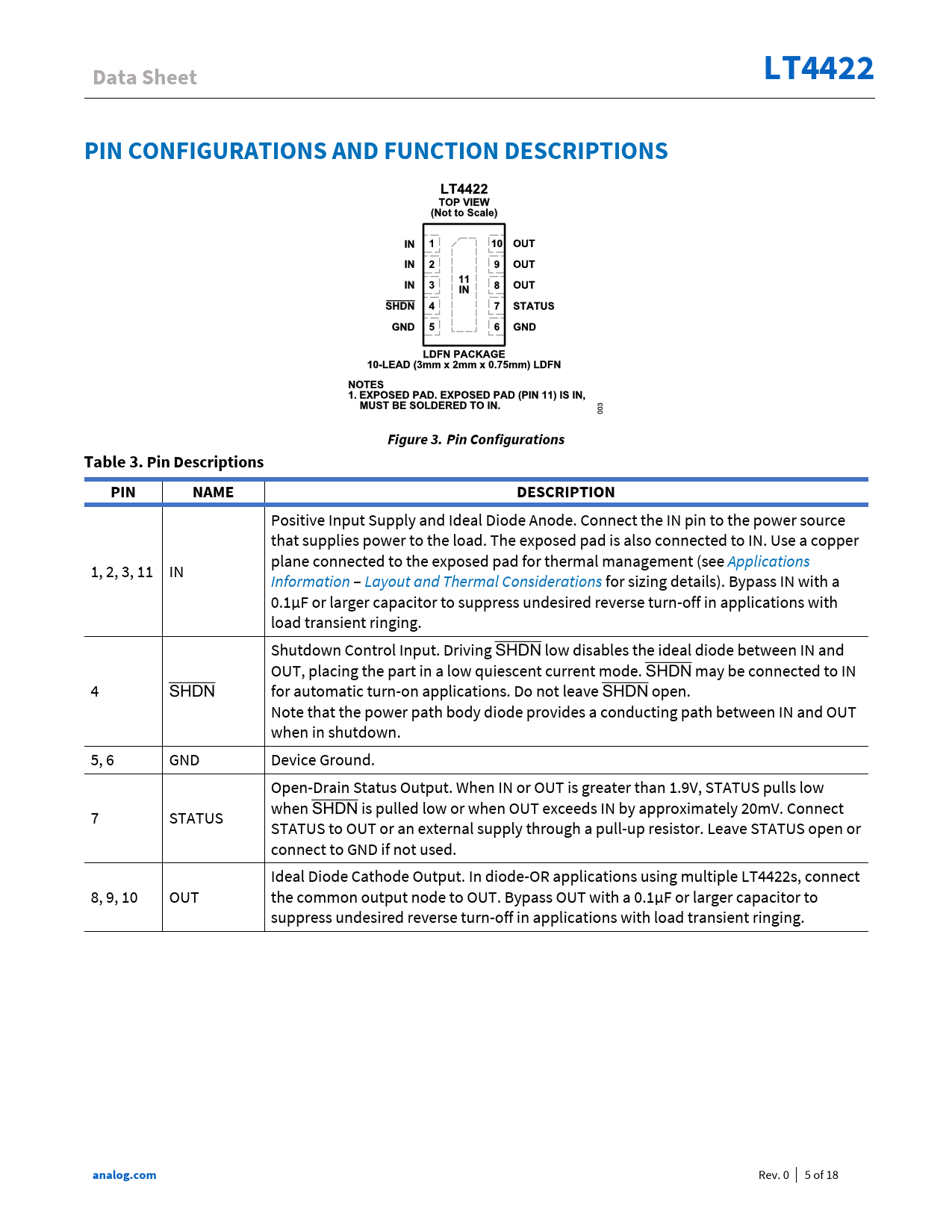 Data Sheet LT4422 PIN CONFIGURATIONS AND FUNCTION DESCRIPTIONS Figure 3 Pin Configurations Table 3 Pin Descriptions PIN