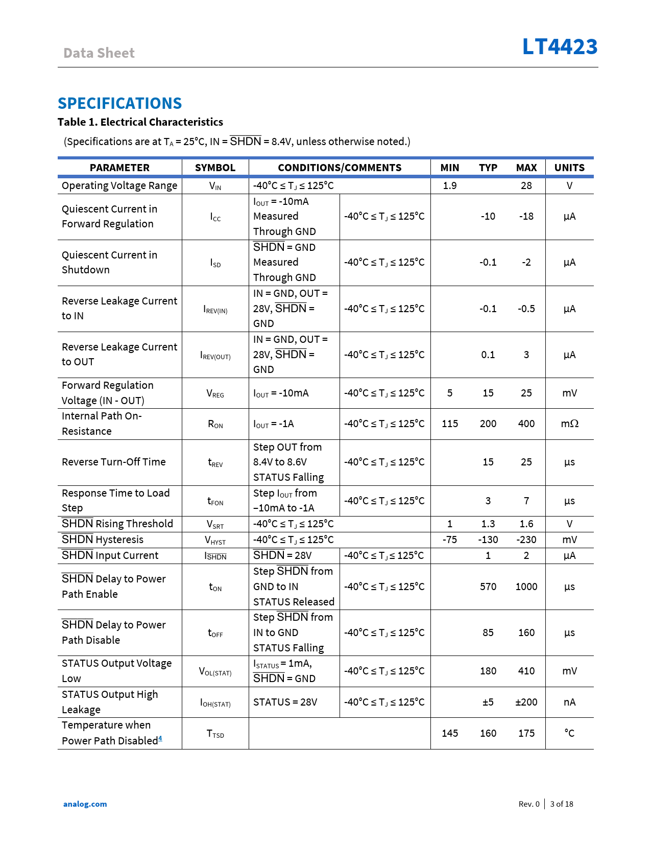 Seiten / Seite18 / 3 — Data Sheet. LT4423. SPECIFICATIONS Table 1. Electrical Characteristics. …