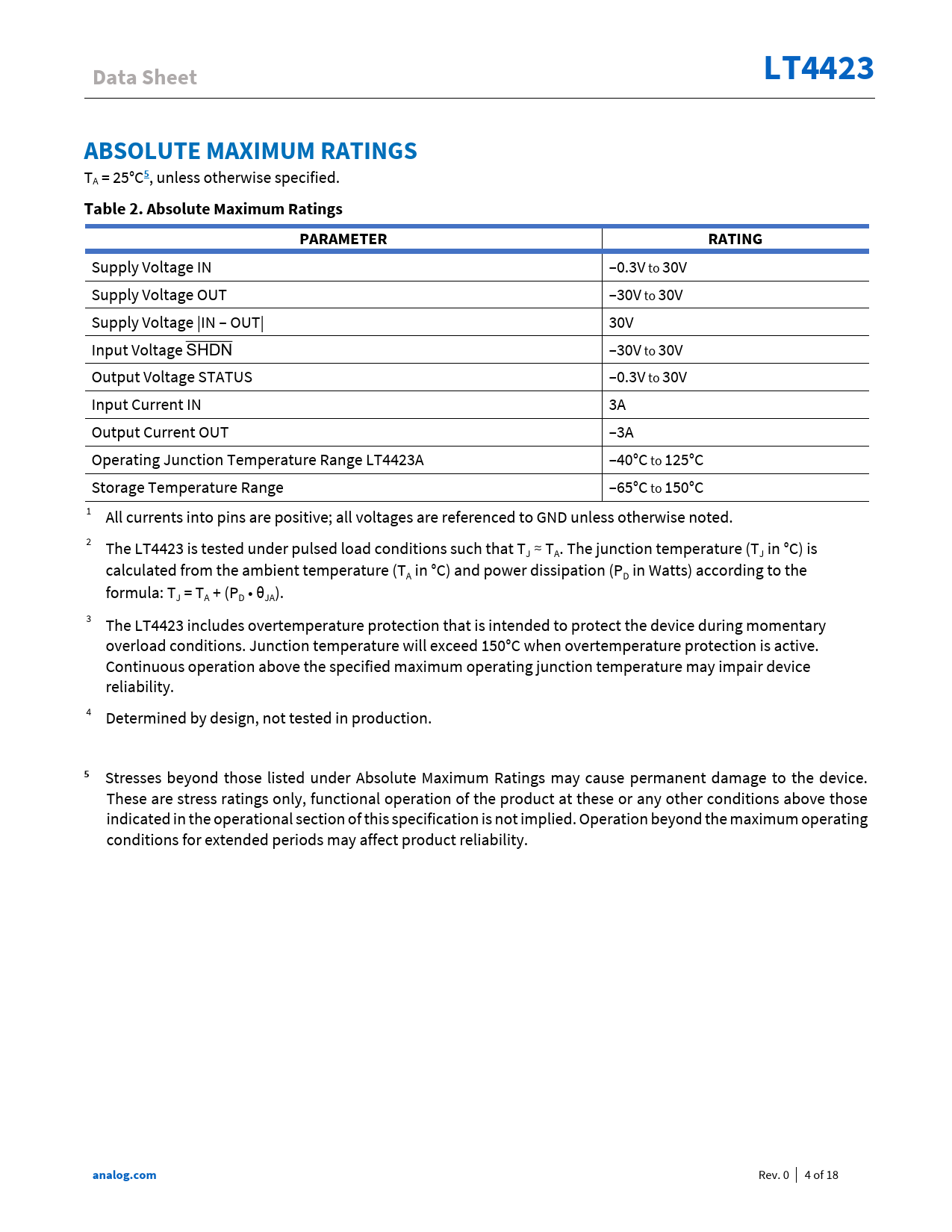 Data Sheet. LT4423. ABSOLUTE MAXIMUM RATINGS. Table 2. Absolute Maximum Ratings. PARAMETER. RATING. analog.com