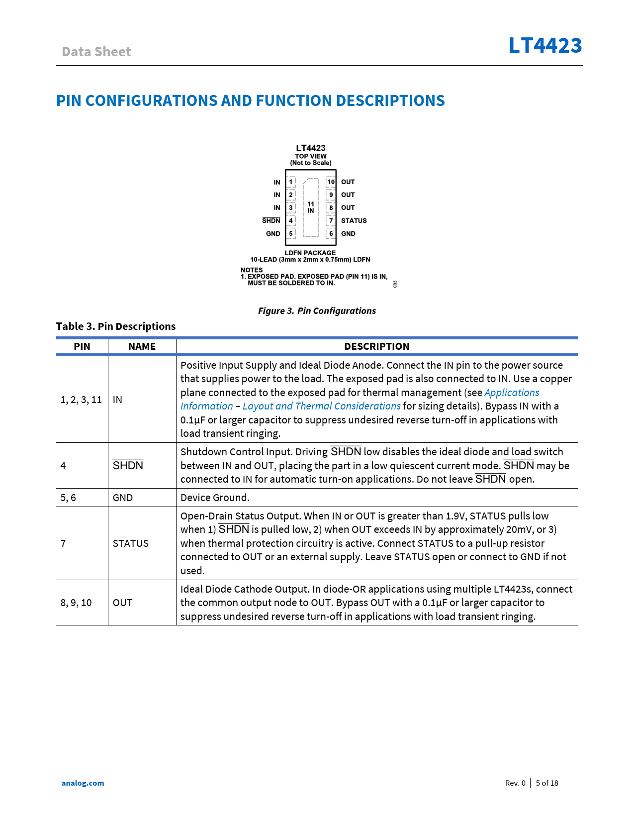 link to page 9 link to page 9 link to page 11 Data SheetLT4423PIN CONFIGURATIONS AND FUNCTION DESCRIPTIONSFigure 3. Pin ConfigurationsTable 3. Pin DescriptionsPINNAMEDESCRIPTION Positive Input Supply and Ideal Diode Anode. Connect the IN pin to the power source that supplies power to the load. The exposed pad is also connected to IN. Use a copper plane connected to the exposed pad for thermal management (see Applications 1, 2, 3, 11 IN Information – Layout and Thermal Considerations for sizing details). Bypass IN with a 0.1µF or larger capacitor to suppress undesired reverse turn-off in applications with load transient ringing. Shutdown Control Input. Driving SHDN low disables the ideal diode and load switch 4 SHDN between IN and OUT, placing the part in a low quiescent current mode. SHDN may be connected to IN for automatic turn-on applications. Do not leave SHDN open. 5, 6 GND Device Ground. Open-Drain Status Output. When IN or OUT is greater than 1.9V, STATUS pulls low when 1) SHDN is pulled low, 2) when OUT exceeds IN by approximately 20mV, or 3) 7 STATUS when thermal protection circuitry is active. Connect STATUS to a pull-up resistor connected to OUT or an external supply. Leave STATUS open or connect to GND if not used. Ideal Diode Cathode Output. In diode-OR applications using multiple LT4423s, connect 8, 9, 10 OUT the common output node to OUT. Bypass OUT with a 0.1µF or larger capacitor to suppress undesired reverse turn-off in applications with load transient ringing. analog.com Rev. 0 5 of 18 Document Outline Features Applications General Description Simplified Application Diagram TABLE OF CONTENTS Revision History Specifications Absolute Maximum Ratings Pin Configurations and Function Descriptions Typical Performance Characteristics Block Diagram Theory of Operation Applications Information USB PD 3.0 and Back-Up Battery Supply Automatic Power Path Control 5V Power Ride-Through High-Voltage Load Switch with Load Sharing and Undervoltage Lockout Layout and Thermal Considerations Typical Applications High-Load Current Application Reverse Input Voltage Protection Related parts Outline Dimensions Ordering Guide