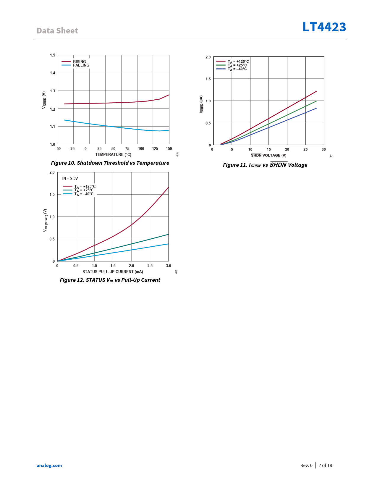 Data SheetLT44231.5RISINGFALLING1.4)1.3(V NDHSV 1.21.11.0–50–250255075100125150TEMPERATURE (°C) 010 Figure 10. Shutdown Threshold vs TemperatureFigure 11. ISHDN vsSHDN Voltage2.0IN = ≥ 5VTA = +125°CTA = +25°C1.5TA = –40°C) (V )T 1.0A T S(LOV0.5000.51.01.52.02.53.0STATUS PULL-UP CURRENT (mA) 012 Figure 12. STATUS VOL vs Pull-Up Currentanalog.com Rev. 0 7 of 18 Document Outline Features Applications General Description Simplified Application Diagram TABLE OF CONTENTS Revision History Specifications Absolute Maximum Ratings Pin Configurations and Function Descriptions Typical Performance Characteristics Block Diagram Theory of Operation Applications Information USB PD 3.0 and Back-Up Battery Supply Automatic Power Path Control 5V Power Ride-Through High-Voltage Load Switch with Load Sharing and Undervoltage Lockout Layout and Thermal Considerations Typical Applications High-Load Current Application Reverse Input Voltage Protection Related parts Outline Dimensions Ordering Guide