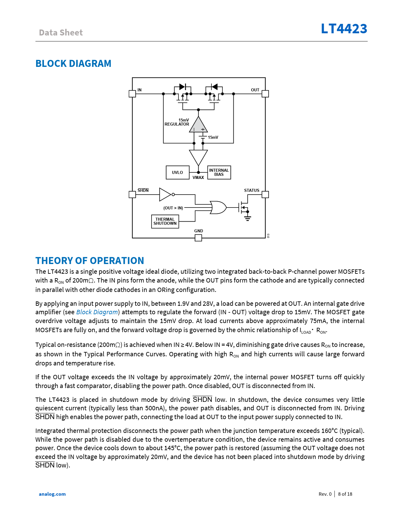 Data Sheet LT4423 BLOCK DIAGRAM IN OUT 15mV REGULATOR 15mV INTERNAL UVLO BIAS VMAX SHDN STATUS (OUT > IN) THERMAL SHUTDOWN GND