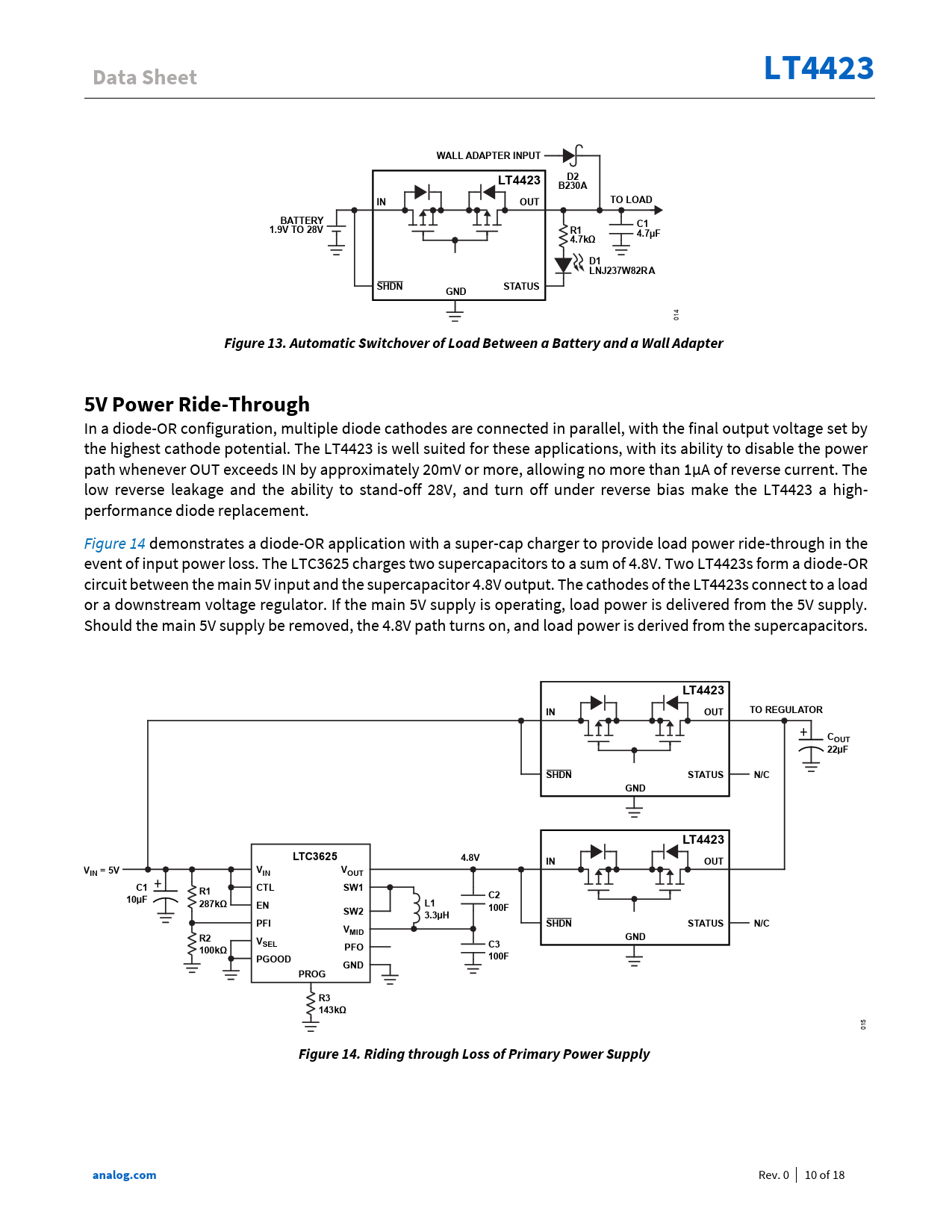 link to page 10 Data SheetLT4423WALL ADAPTER INPUTD2LT4423B230AINOUTTO LOADBATTERYC11.9V TO 28VR14.7µF4.7kΩD1LNJ237W82RASHDNGNDSTATUS 014 Figure 13. Automatic Switchover of Load Between a Battery and a Wall Adapter5V Power Ride-Through In a diode-OR configuration, multiple diode cathodes are connected in parallel, with the final output voltage set by the highest cathode potential. The LT4423 is well suited for these applications, with its ability to disable the power path whenever OUT exceeds IN by approximately 20mV or more, allowing no more than 1µA of reverse current. The low reverse leakage and the ability to stand-off 28V, and turn off under reverse bias make the LT4423 a high- performance diode replacement. Figure 14 demonstrates a diode-OR application with a super-cap charger to provide load power ride-through in the event of input power loss. The LTC3625 charges two supercapacitors to a sum of 4.8V. Two LT4423s form a diode-OR circuit between the main 5V input and the supercapacitor 4.8V output. The cathodes of the LT4423s connect to a load or a downstream voltage regulator. If the main 5V supply is operating, load power is delivered from the 5V supply. Should the main 5V supply be removed, the 4.8V path turns on, and load power is derived from the supercapacitors. LT4423TO REGULATORINOUTCOUT 22µFSHDNSTATUSN/CGNDLT4423LTC36254.8VINOUTVIN = 5VVINVOUTC1CTLSW1R1C210µF287kΩENL1SW2100F3.3µHPFISHDNSTATUSN/CVMIDR2VGNDSELPFOC3100kΩPGOOD100FGNDPROGR3 143kΩ 015 Figure 14. Riding through Loss of Primary Power Supplyanalog.com Rev. 0 10 of 18 Document Outline Features Applications General Description Simplified Application Diagram TABLE OF CONTENTS Revision History Specifications Absolute Maximum Ratings Pin Configurations and Function Descriptions Typical Performance Characteristics Block Diagram Theory of Operation Applications Information USB PD 3.0 and Back-Up Battery Supply Automatic Power Path Control 5V Power Ride-Through High-Voltage Load Switch with Load Sharing and Undervoltage Lockout Layout and Thermal Considerations Typical Applications High-Load Current Application Reverse Input Voltage Protection Related parts Outline Dimensions Ordering Guide