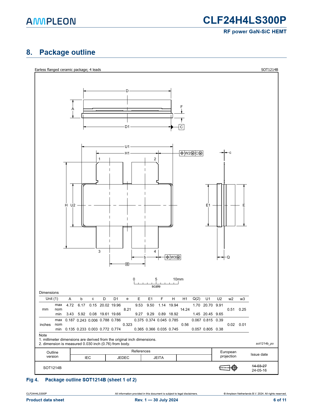 CLF24H4LS300P. RF power GaN-SiC HEMT. 8. Package. outline. Fig 4. Package outline SOT1214B (sheet 1 of 2). Product data sheet