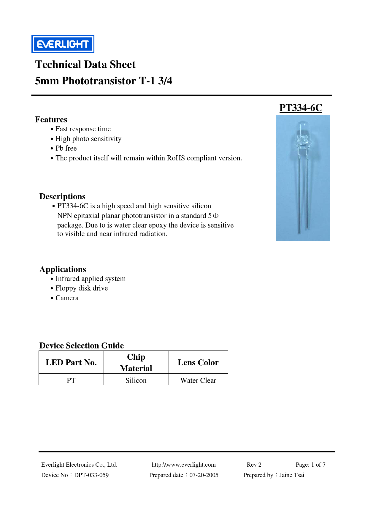 PT Silicon Water Clear Everlight Electronics Co., Ltd. http:\\www.everlight.com Rev 2 Page: 1 of 7 Device No:DPT-033-059 Prepared date:07-20-2005 Prepared by:Jaine Tsai