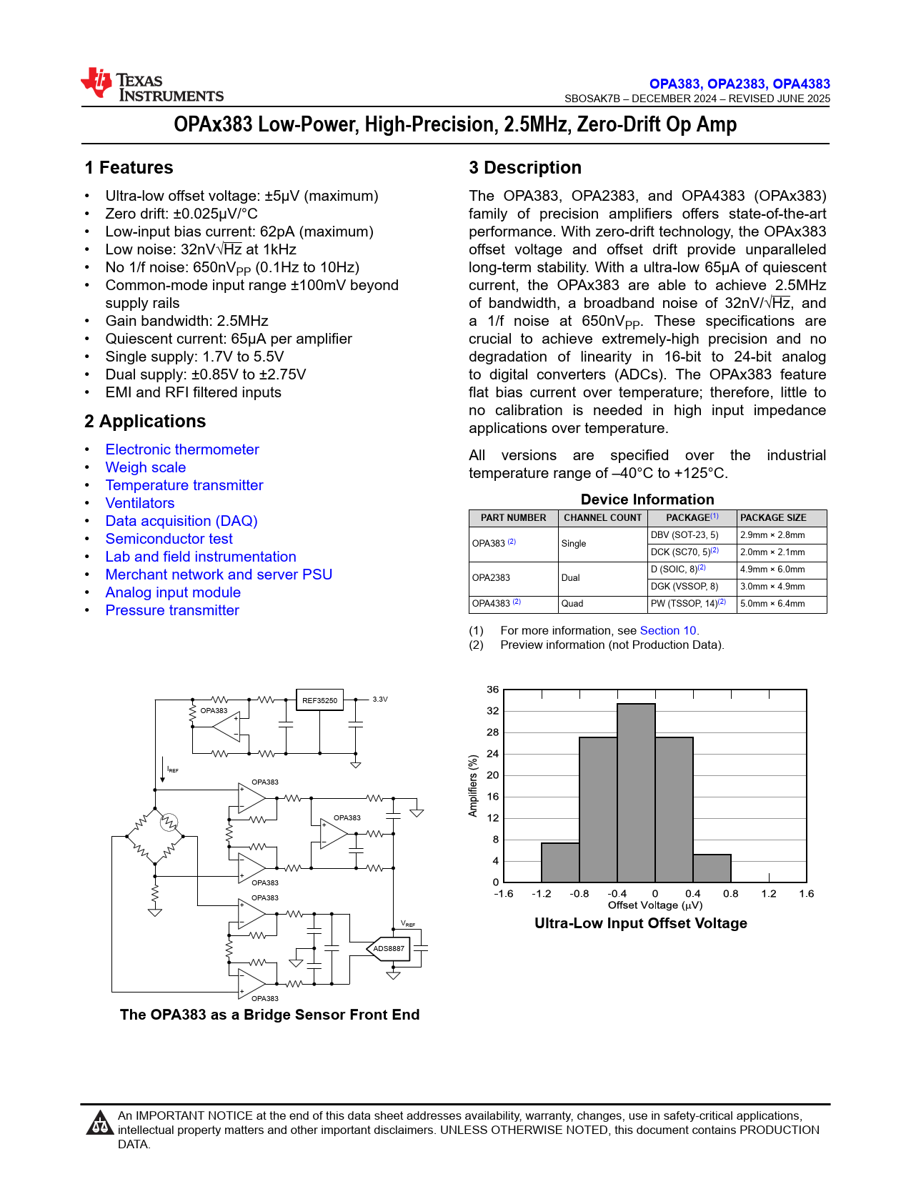 link to page 1 link to page 1 link to page 1 link to page 1 link to page 1 link to page 1 link to page 23 OPA383, OPA2383, OPA4383 SBOSAK7B – DECEMBER 2024 – REVISED JUNE 2025 OPAx383 Low-Power, High-Precision, 2.5MHz, Zero-Drift Op Amp1 Features3 Description • Ultra-low offset voltage: ±5µV (maximum) The OPA383, OPA2383, and OPA4383 (OPAx383) • Zero drift: ±0.025µV/°C family of precision amplifiers offers state-of-the-art • Low-input bias current: 62pA (maximum) performance. With zero-drift technology, the OPAx383 • Low noise: 32nV√Hz at 1kHz offset voltage and offset drift provide unparalleled • No 1/f noise: 650nVPP (0.1Hz to 10Hz) long-term stability. With a ultra-low 65µA of quiescent • Common-mode input range ±100mV beyond current, the OPAx383 are able to achieve 2.5MHz supply rails of bandwidth, a broadband noise of 32nV/√Hz, and • Gain bandwidth: 2.5MHz a 1/f noise at 650nVPP. These specifications are • Quiescent current: 65μA per amplifier crucial to achieve extremely-high precision and no • Single supply: 1.7V to 5.5V degradation of linearity in 16-bit to 24-bit analog • Dual supply: ±0.85V to ±2.75V to digital converters (ADCs). The OPAx383 feature • EMI and RFI filtered inputs flat bias current over temperature; therefore, little to no calibration is needed in high input impedance 2 Applications applications over temperature. • Electronic thermometer All versions are specified over the industrial • Weigh scale temperature range of –40°C to +125°C. • Temperature transmitter • Ventilators Device Information • Data acquisition (DAQ) PART NUMBERCHANNEL COUNTPACKAGE (1) PACKAGE SIZE • Semiconductor test DBV (SOT-23, 5) 2.9mm × 2.8mm OPA383 (2) Single • Lab and field instrumentation DCK (SC70, 5)(2) 2.0mm × 2.1mm • Merchant network and server PSU D (SOIC, 8)(2) 4.9mm × 6.0mm OPA2383 Dual • Analog input module DGK (VSSOP, 8) 3.0mm × 4.9mm • Pressure transmitter OPA4383 (2) Quad PW (TSSOP, 14)(2) 5.0mm × 6.4mm (1) For more information, see Section 10. (2) Preview information (not Production Data). 3.3V REF35250 OPA383 + – IREF OPA383 + – OPA383 + – – + OPA383 OPA383 + – V Ultra-Low Input Offset Voltage REF ADS8887 – + OPA383 The OPA383 as a Bridge Sensor Front End An IMPORTANT NOTICE at the end of this data sheet addresses availability, warranty, changes, use in safety-critical applications, intellectual property matters and other important disclaimers. UNLESS OTHERWISE NOTED, this document contains PRODUCTION DATA. Document Outline 1 Features 2 Applications 3 Description Table of Contents 4 Pin Configuration and Functions 5 Specifications 5.1 Absolute Maximum Ratings 5.2 ESD Ratings 5.3 Recommended Operating Conditions 5.4 Thermal Information OPA383 5.5 Thermal Information OPA2383 5.6 Electrical Characteristics 5.7 Typical Characteristics 6 Detailed Description 6.1 Overview 6.2 Functional Block Diagram 6.3 Feature Description 6.3.1 Input Bias Current 6.3.2 EMI Susceptibility and Input Filtering 6.4 Device Functional Modes 7 Application and Implementation 7.1 Application Information 7.1.1 Zero-Drift Clocking 7.2 Typical Applications 7.2.1 Bidirectional Current Sensing 7.2.1.1 Design Requirements 7.2.1.2 Detailed Design Procedure 7.2.1.3 Application Curve 7.2.2 Bridge Sensor Measurement 7.3 Power Supply Recommendations 7.4 Layout 7.4.1 Layout Guidelines 7.4.2 Layout Example 8 Device and Documentation Support 8.1 Device Support 8.1.1 Development Support 8.1.1.1 PSpice® for TI 8.1.1.2 TINA-TI™ Simulation Software (Free Download) 8.2 Receiving Notification of Documentation Updates 8.3 Support Resources 8.4 Trademarks 8.5 Electrostatic Discharge Caution 8.6 Glossary 9 Revision History 10 Mechanical, Packaging, and Orderable Information