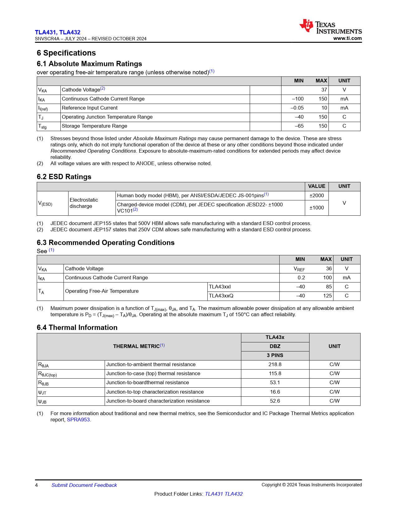 TLA431, TLA432. www.ti.com. 6 Specifications 6.1 Absolute Maximum Ratings. MIN. MAX. UNIT. 6.2 ESD Ratings. VALUE