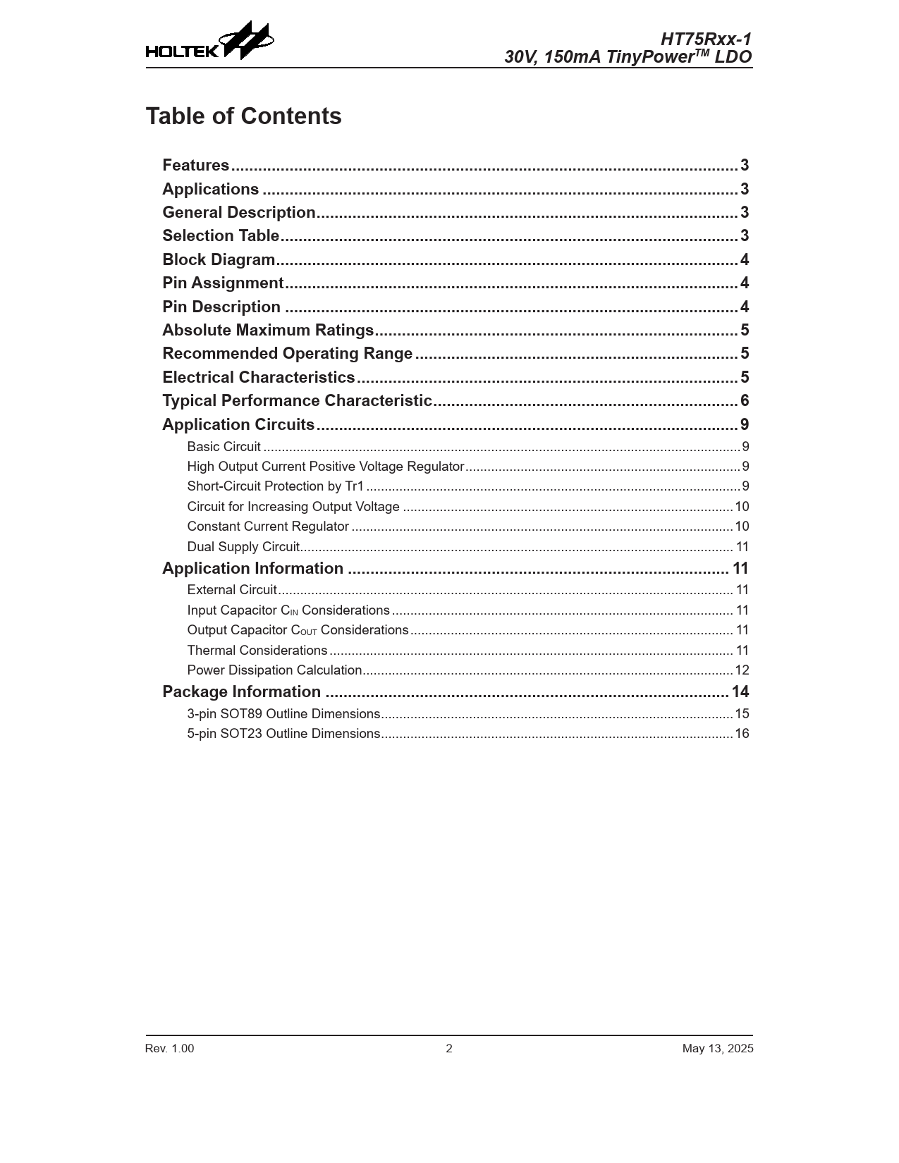 link to page 3 link to page 3 link to page 3 link to page 3 link to page 4 link to page 4 link to page 4 link to page 5 link to page 5 link to page 5 link to page 6 link to page 9 link to page 9 link to page 9 link to page 9 link to page 10 link to page 10 link to page 11 link to page 11 link to page 11 link to page 11 link to page 11 link to page 11 link to page 12 link to page 14 link to page 15 link to page 16 HT75Rxx-130V, 150mA TinyPowerTM LDOTable of ContentsFeatures ...3 Applications ..3 General Description ..3 Selection Table ..3Block Diagram ...4 Pin Assignment ...4 Pin Description ...4Absolute Maximum Ratings ...5 Recommended Operating Range ..5 Electrical Characteristics ...5Typical Performance Characteristic ..6Application Circuits ..9 Basic Circuit ..9 High Output Current Positive Voltage Regulator ...9 Short-Circuit Protection by Tr1 ..9 Circuit for Increasing Output Voltage ..10 Constant Current Regulator ..10 Dual Supply Circuit .. 11 Application Information ... 11 External Circuit .. 11 Input Capacitor CIN Considerations ... 11 Output Capacitor COUT Considerations .. 11 Thermal Considerations .. 11 Power Dissipation Calculation ...12 Package Information ..14 3-pin SOT89 Outline Dimensions ..15 5-pin SOT23 Outline Dimensions ..16 Rev. 1.00 2 May 13, 2025 Document Outline Features Applications General Description Selection Table Block Diagram Pin Assignment Pin Description Absolute Maximum Ratings Recommended Operating Range Electrical Characteristics Typical Performance Characteristic Application Circuits Basic Circuit High Output Current Positive Voltage Regulator Short-Circuit Protection by Tr1 Circuit for Increasing Output Voltage Constant Current Regulator Dual Supply Circuit Application Information External Circuit Input Capacitor CIN Considerations Output Capacitor COUT Considerations Thermal Considerations Power Dissipation Calculation Package Information 3-pin SOT89 Outline Dimensions 5-pin SOT23 Outline Dimensions
