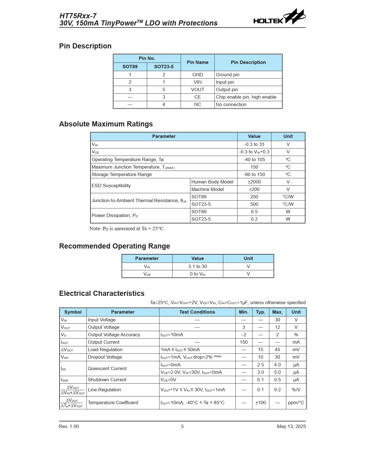 HT75Rxx-7. 30V, 150mA TinyPowerTM LDO with Protections. Pin Description. Pin No. Pin Name. SOT89. SOT23-5. Absolute Maximum Ratings