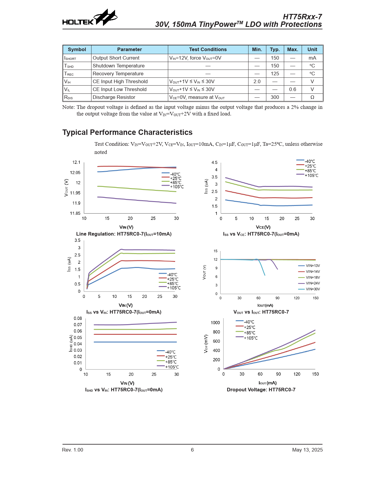 HT75Rxx-7 30V, 150mA TinyPowerTM LDO with Protections Symbol Parameter Test Conditions Min. Typ. Max. Unit