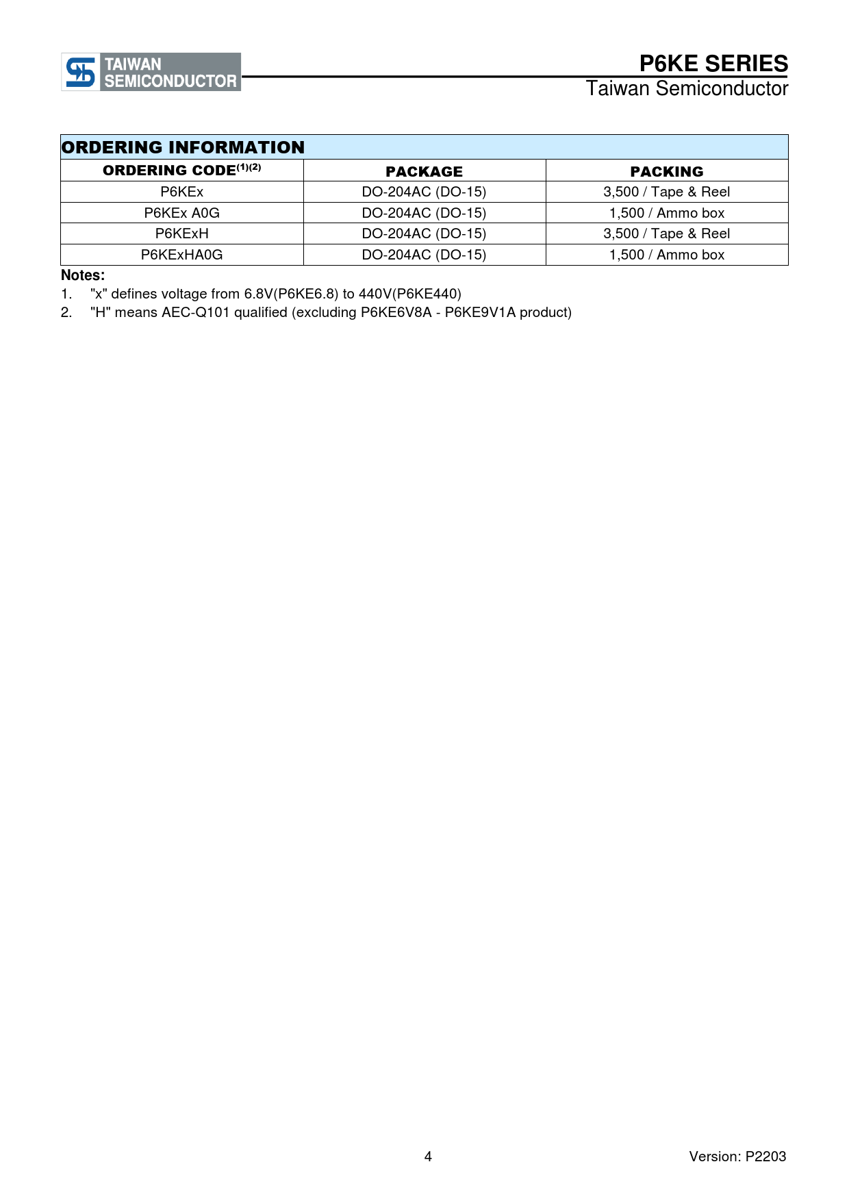1. "x" defines voltage from 6.8V(P6KE6.8) to 440V(P6KE440) 2. "H" means AEC-Q101 qualified (excluding P6KE6V8A - P6KE9V1A product) 4 Version: P2203